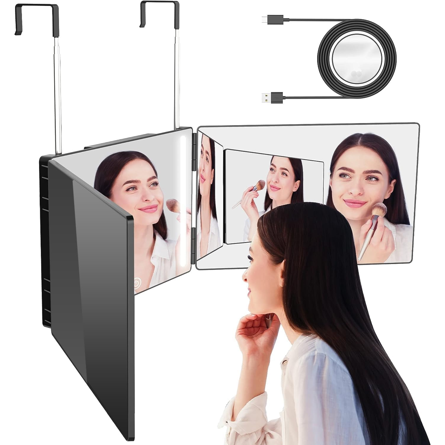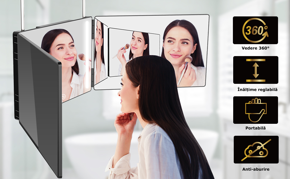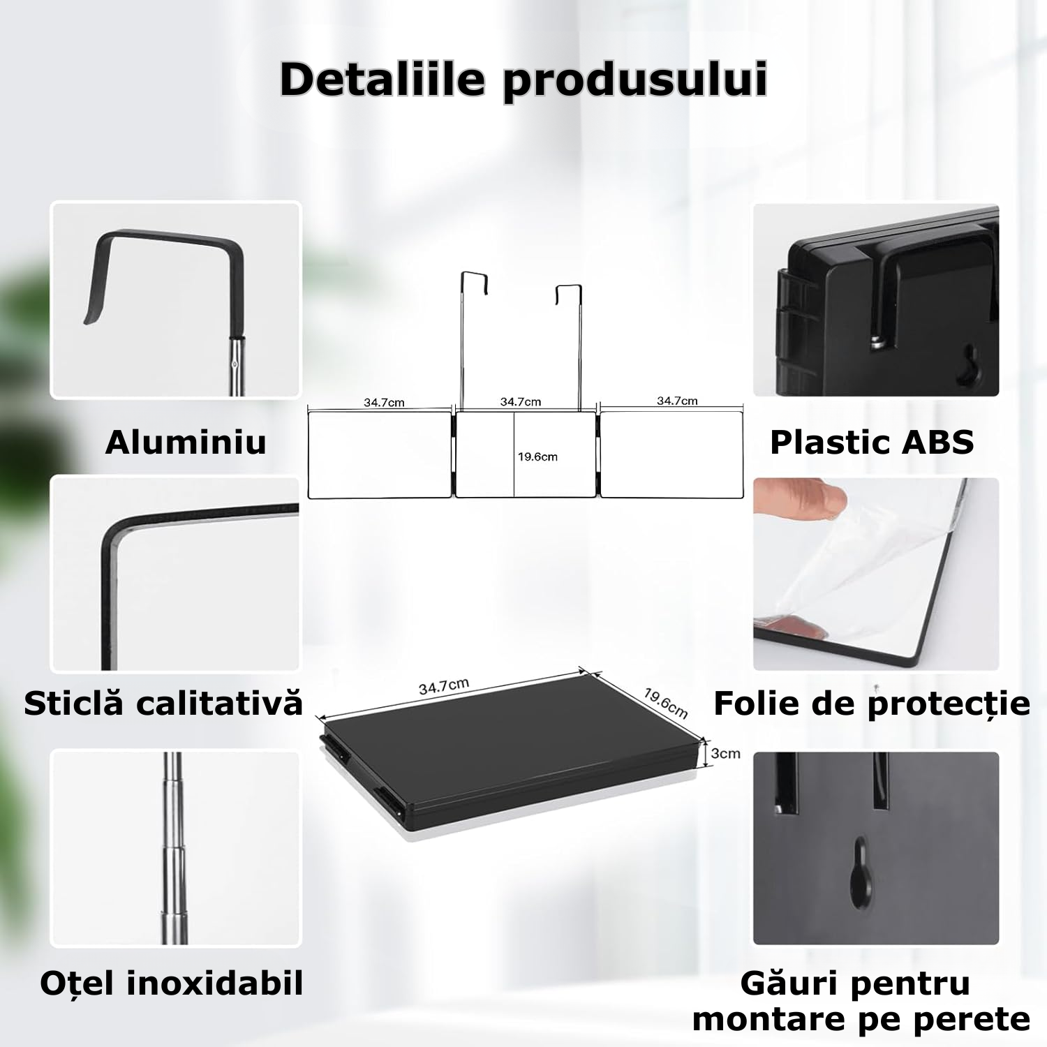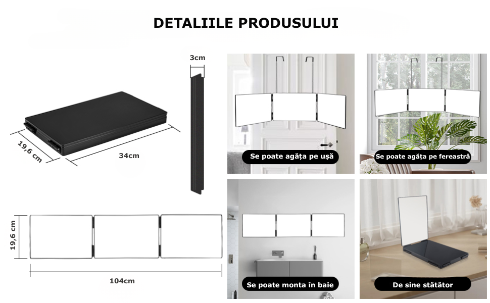 Oglinda ajustabila si usor de transportat: Datorita consolelor sale reglabile puternice, se poate monta si atasa foarte usor in baie, dormitor, tot ce aveti nevoie este o usa pentru a pozitiona oglinda cu 3 directii la inaltimea perfecta.