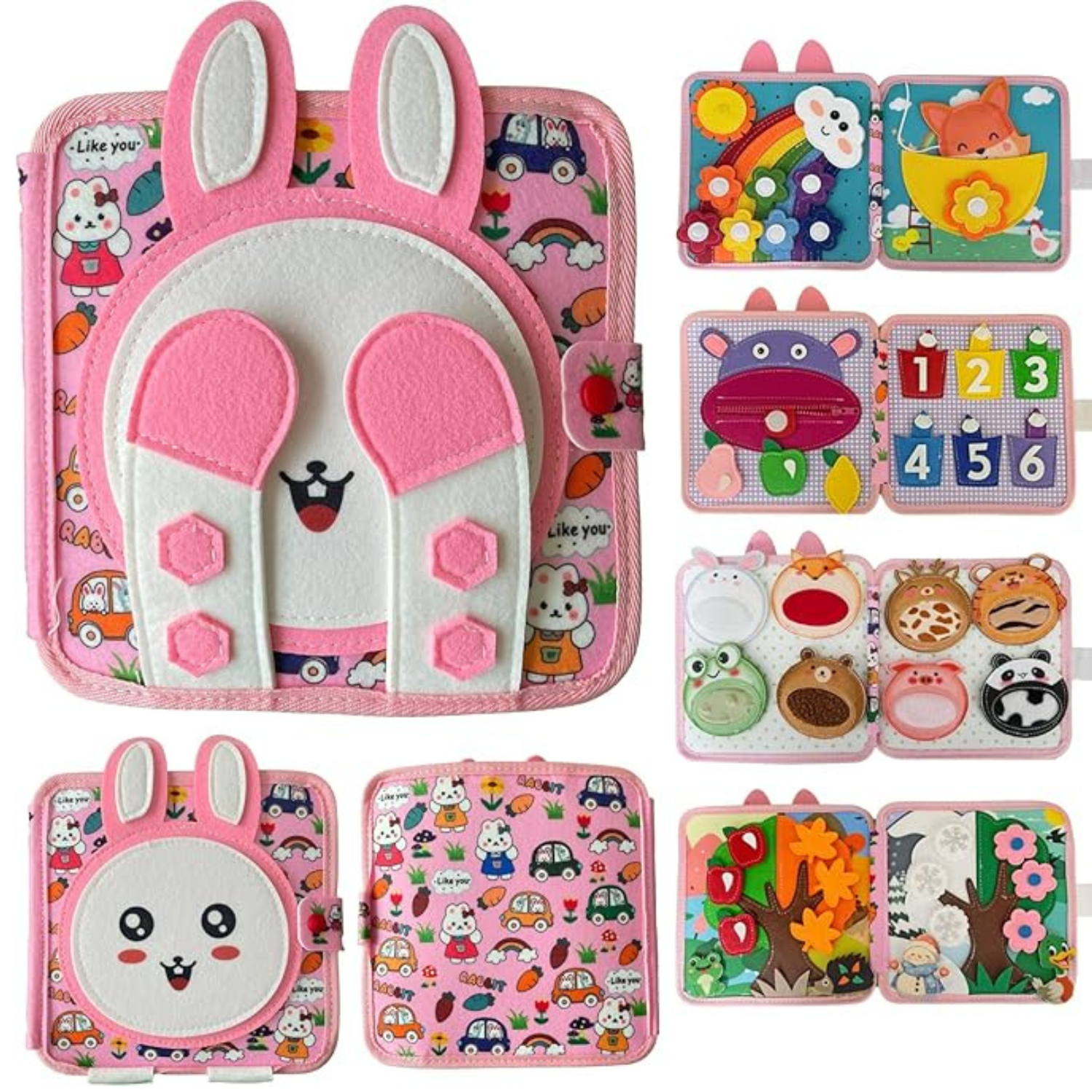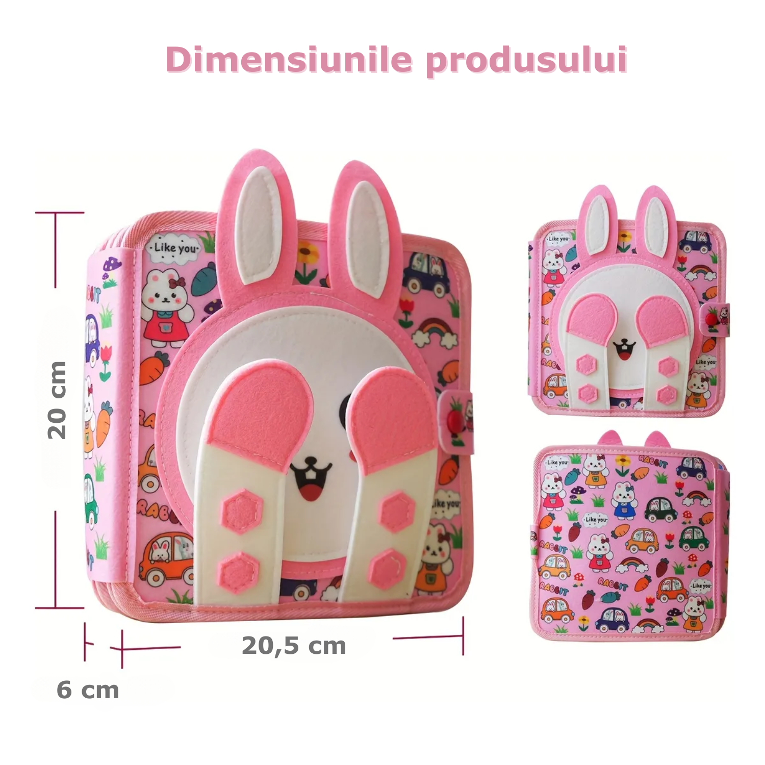 Carte educativa Montessori, cu activitati senzoriale, Simply Joy, 10 pagini pentru dezvoltarea abilitatilor de baza, jucarie educativa pentru calatorii, activitati multiple, cadou pentru bebelusi, fete si baieti, Model Iepure