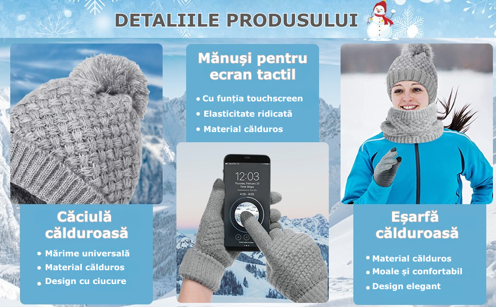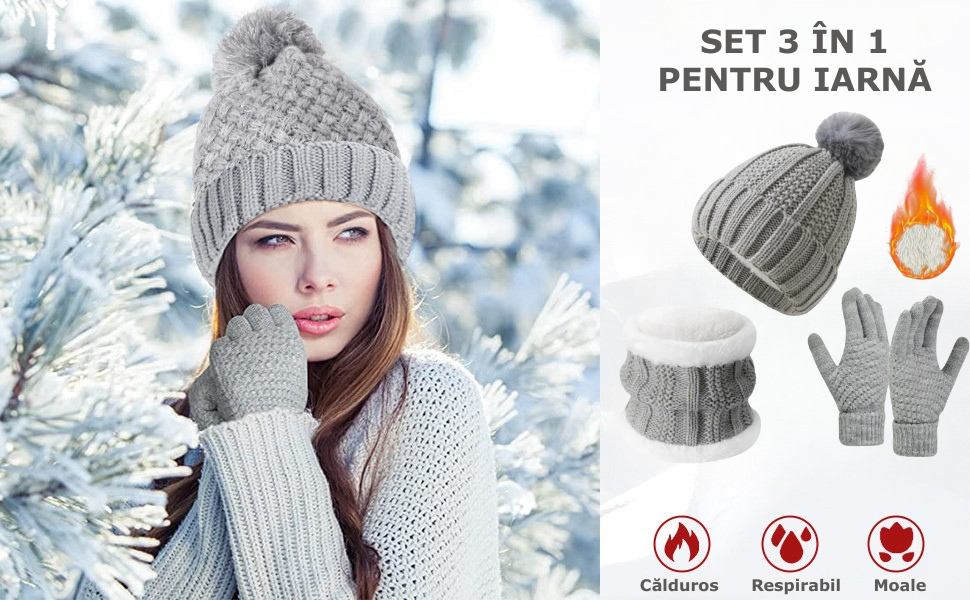 Ce contine setul: Vei primi 3 bucati in setul de iarna pentru femei: o caciula de iarna, un fular de iarna si un set de manusi de iarna cu functia touchscreen. Toate sunt captusite cu lana artificiala, tricotate precis pentru a va proteja de vant si de frig, ceea ce imbunatateste considerabil caldura si confortul pe timp de iarna. Sunt moi, au marime universala, sunt elastice si se poate intinde pentru a se potrivi majoritatii femeilor.