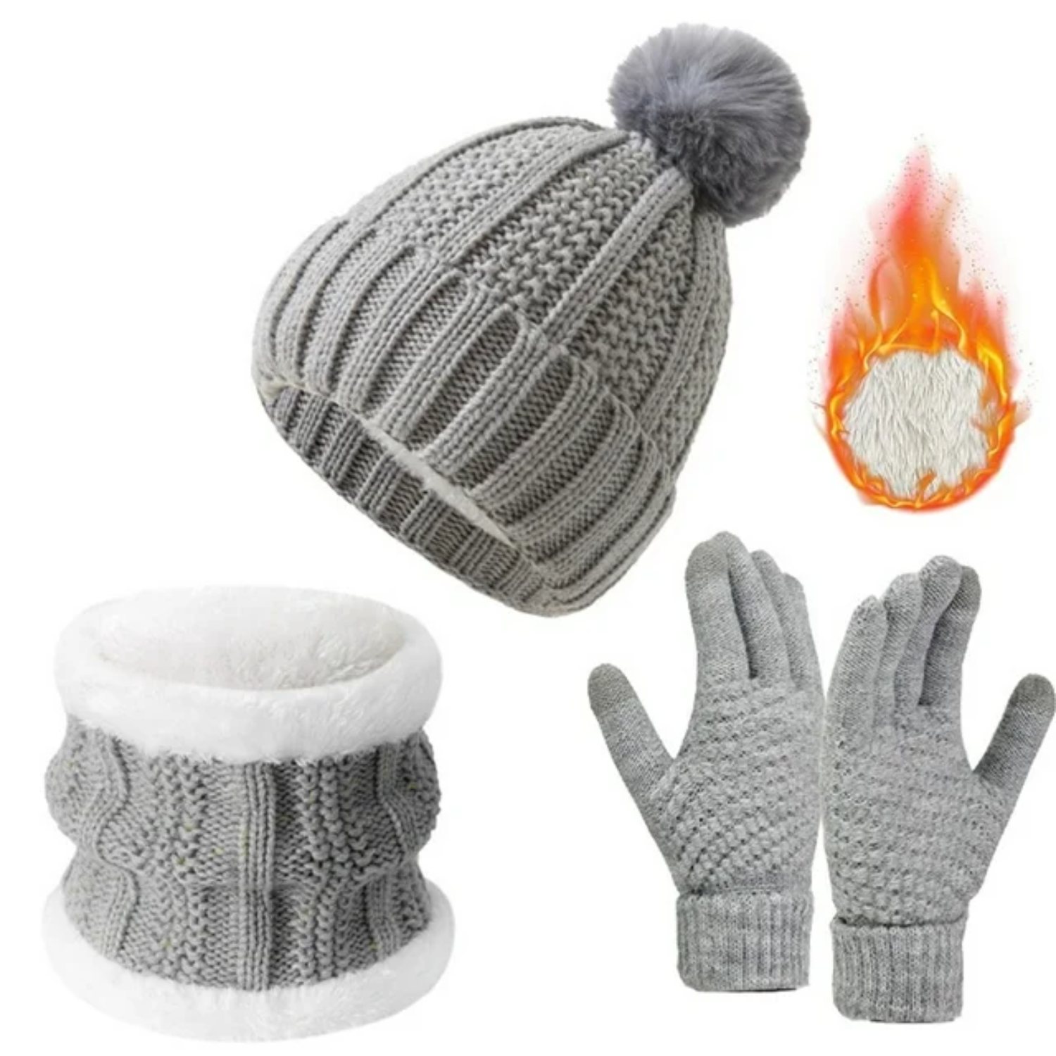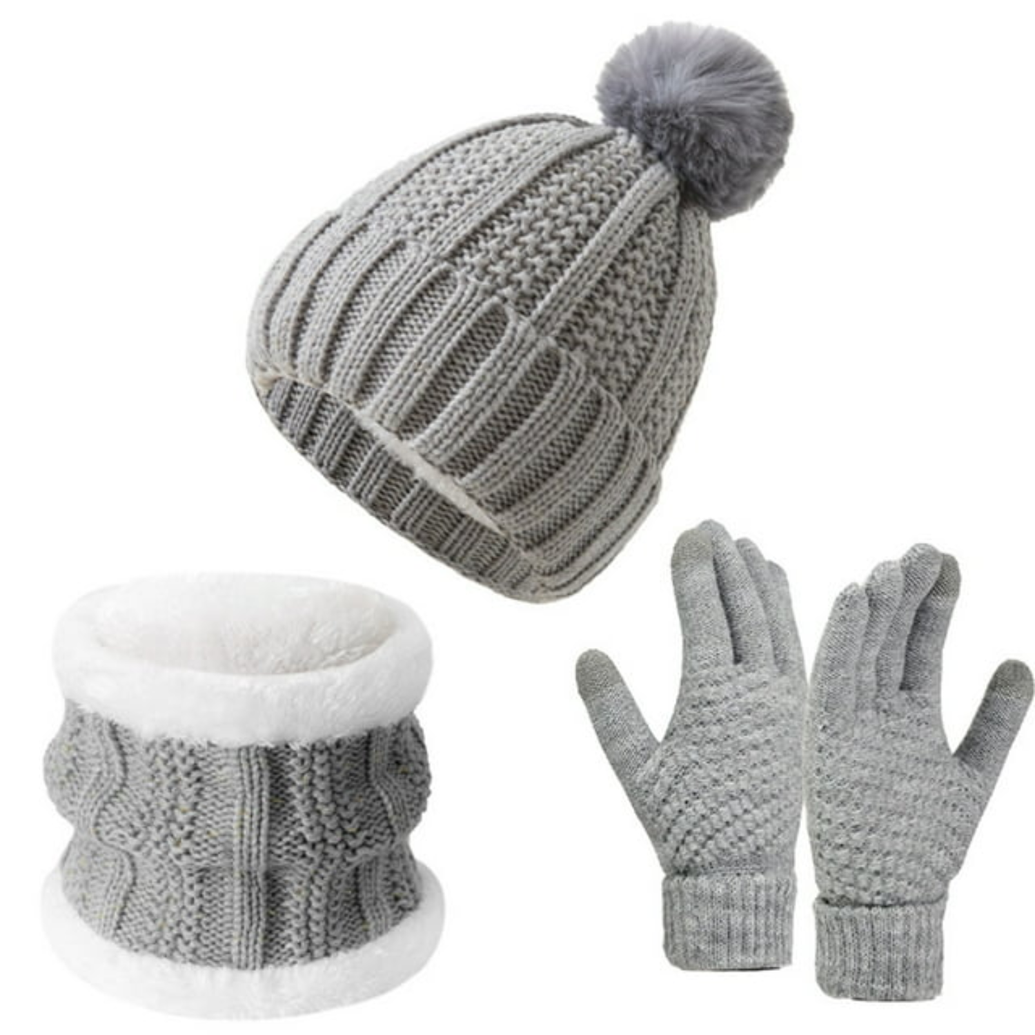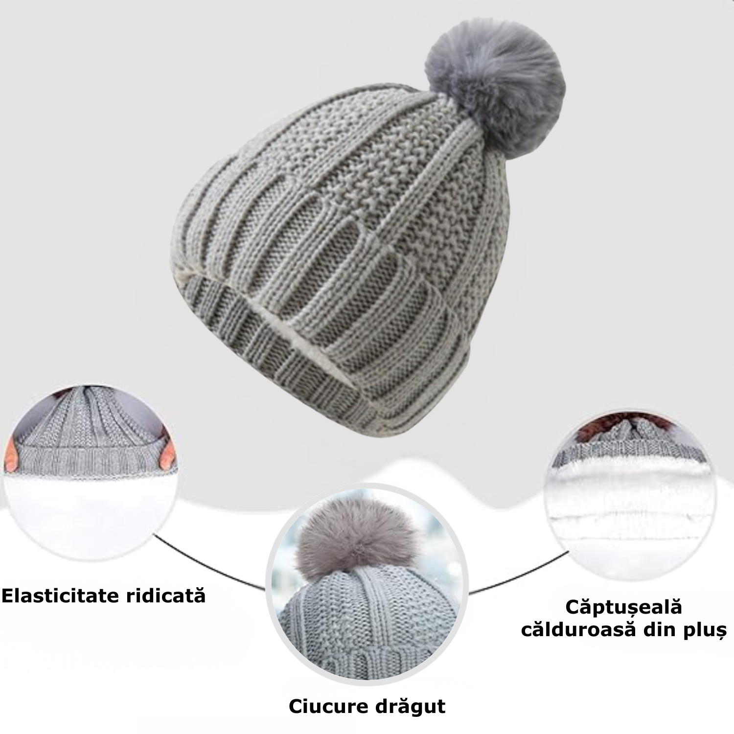 Caciula Dama, Set de iarna 3 in1, Simply Joy, caciula, fular, manusi cu functie touchscreen, pentru femei, captuseala calduroasa, tematica cozy winter, marime universala,Cadou Dama pentru Mos Nicolae, Craciun, Zile de Nastere, Gri