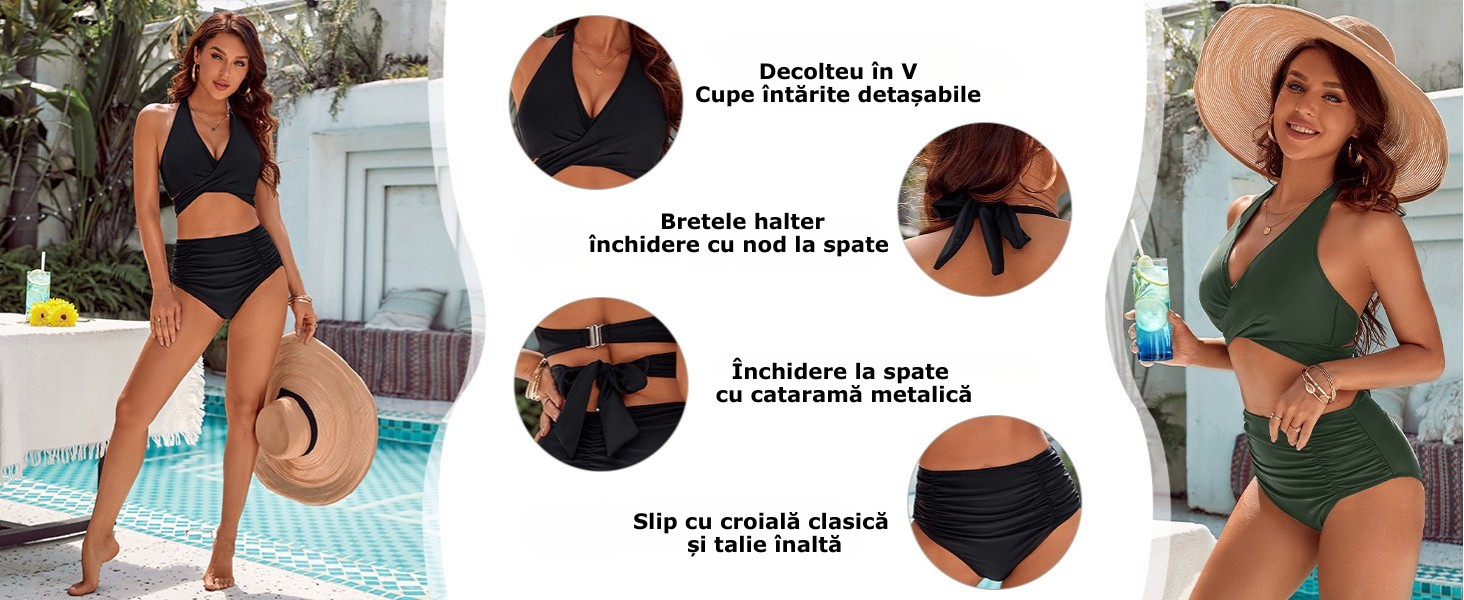 Conceput pentru femeia stilata, are un decolteu adanc in V si bretele reglabile, cu cupe moi detasabile pentru un suport personalizabil. Bretele halter ridica si sustin bustul, va ajuta sa reglati lungimea costumului de baie pentru ca acesta sa arate perfect pe corp.