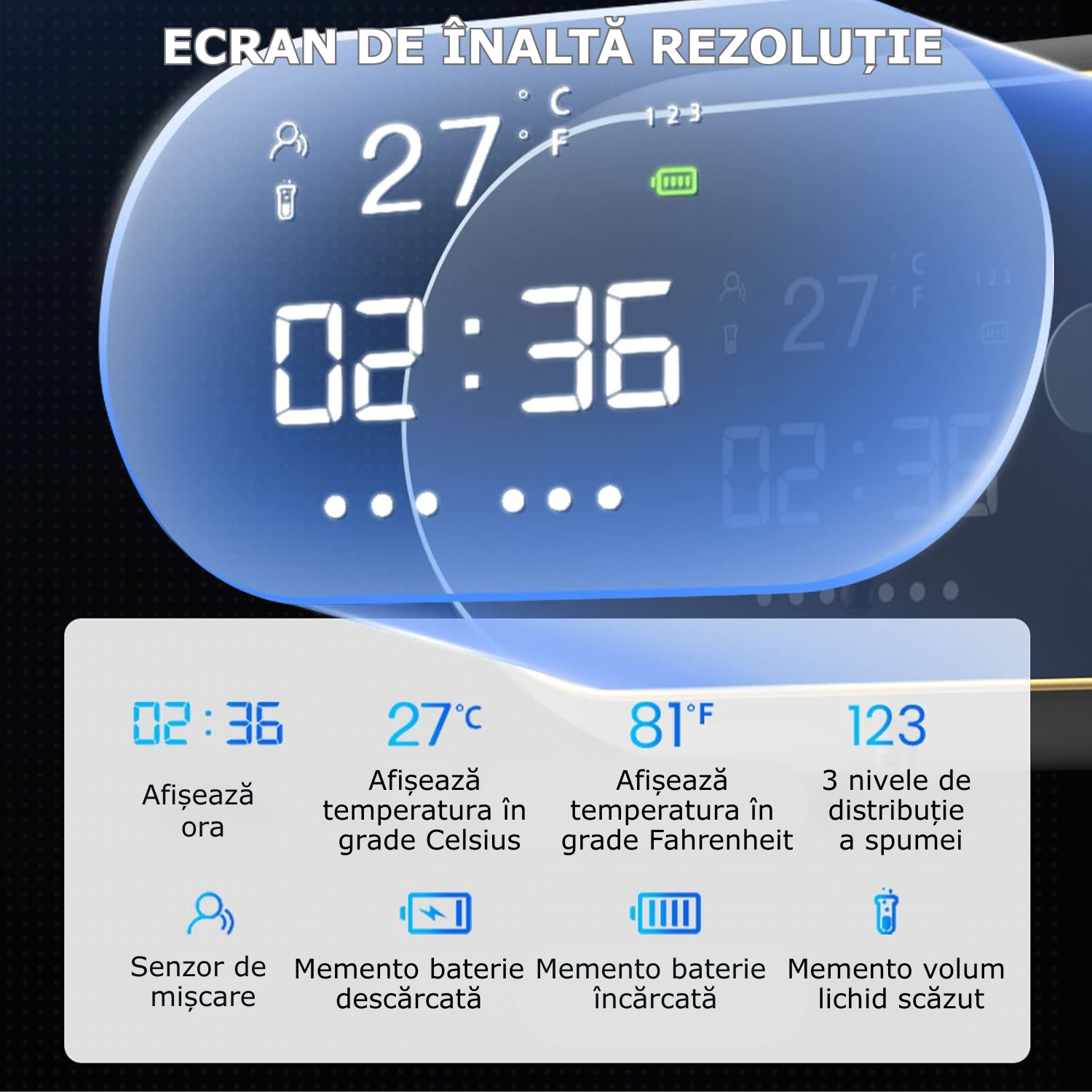 Ecran mare de inalta rezolutie si senzor de miscare inteligent: Cu senzor de miscare incorporat, atunci cand va aflati in apropierea distribuitorului, ecranul dozatorului se va aprinde si va afisa clar ora, temperatura ambiantala (°C/°F), starea de lucru si starea bateriei.