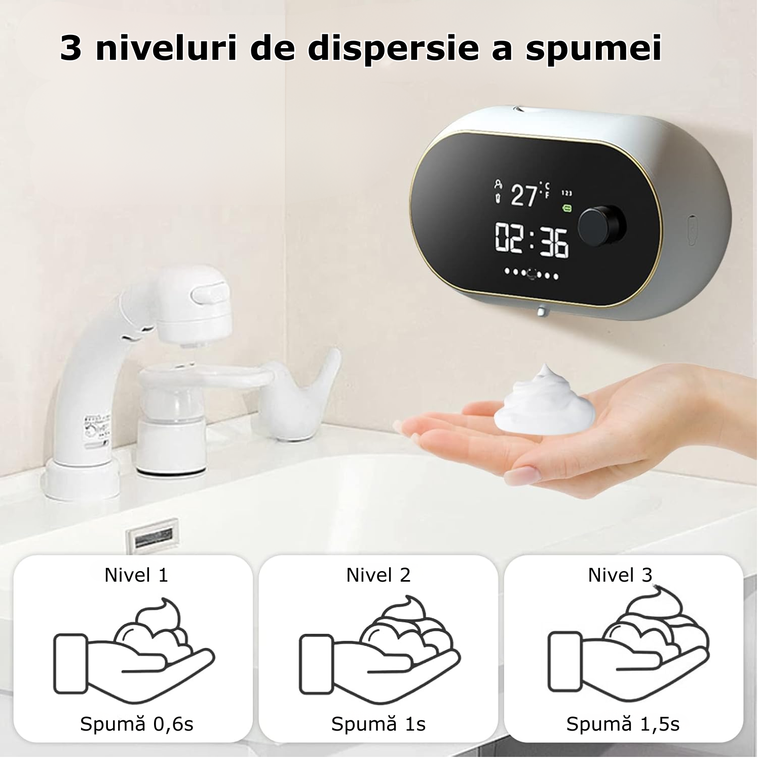 Acest dozator de sapun spuma are 3 niveluri de dispersie a volumului de spuma pentru a satisface nevoile adultilor si copiilor. Faceti click pe buton pentru a regla puterea de dispersie a spumei.