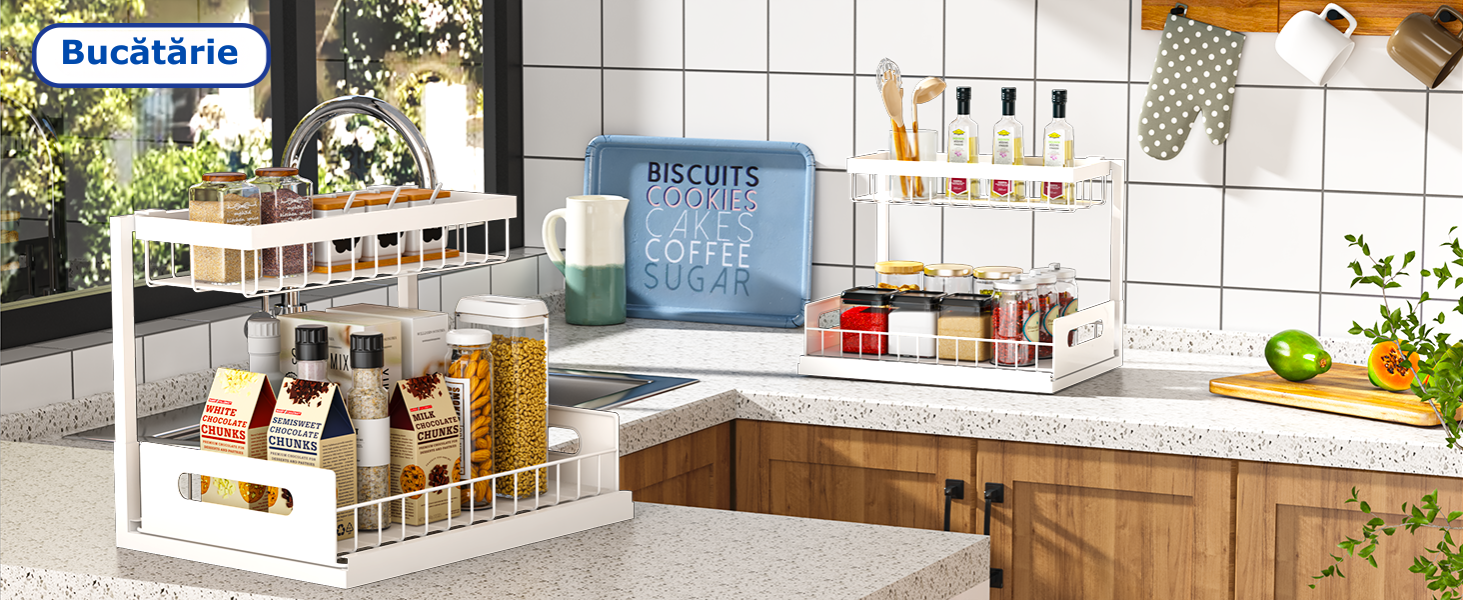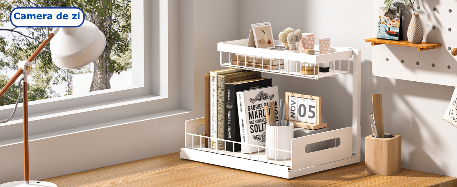 Produs versatil pentru organizare si depozitare: Organizatorul cu 2 rafturi este potrivit pentru bucatarie, baie, balcon, dulap, sufragerie, birou, gradina sau orice alt loc in care doriti sa organizati spatiu suplimentar, trebuie doar sa il folositi in functie de nevoile dumneavoastra pentru a avea totul organizat. Organizatorul este conceput ca un sertar glisant cu manere ce poate fi scos din ambele parti, permitandu-va sa accesati cu usurinta articolele depozitate in partea de jos.