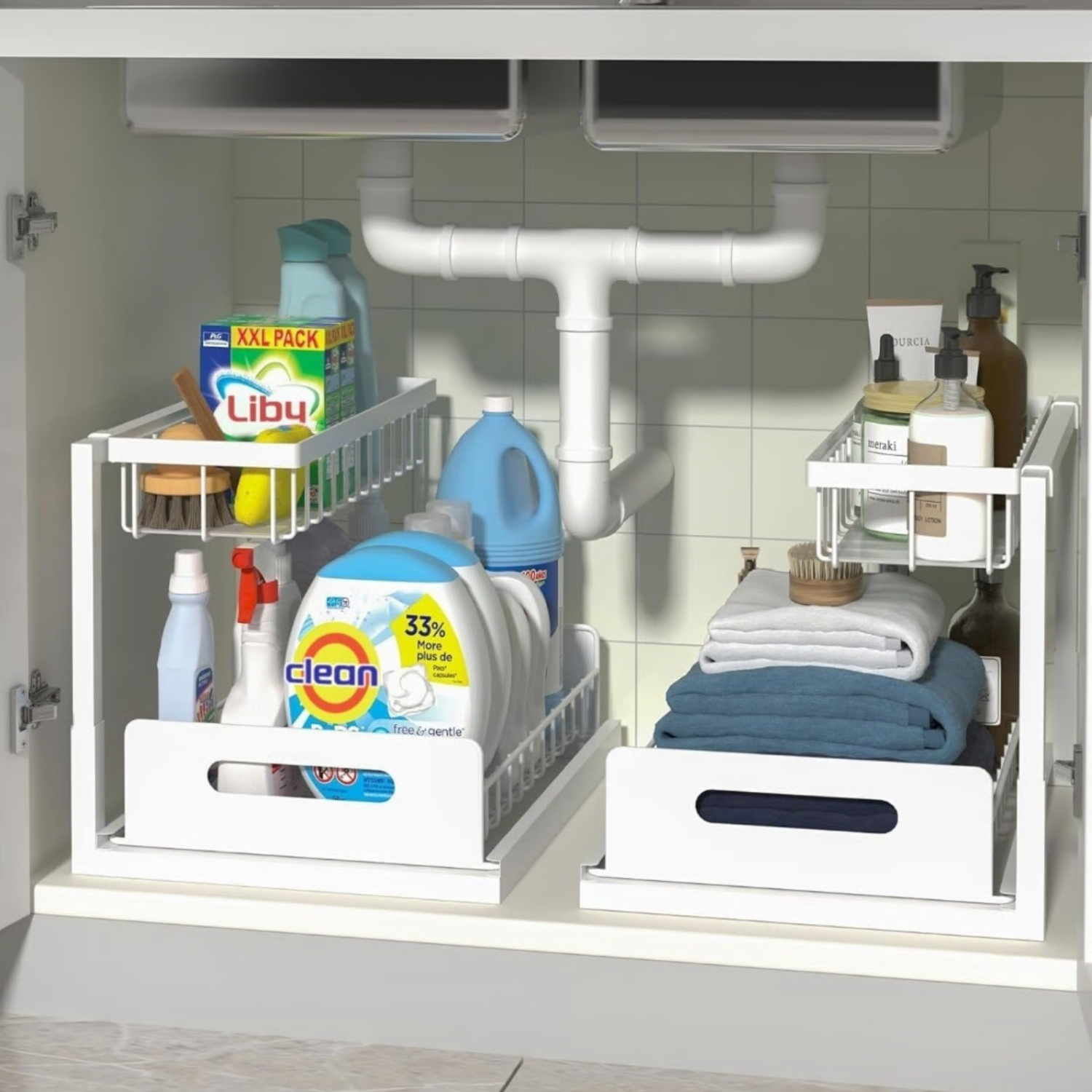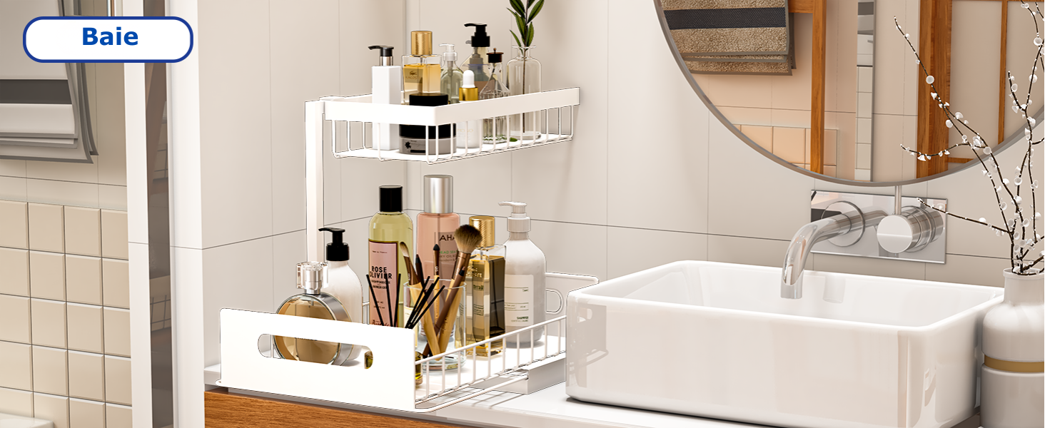 Usor de instalat Si instalare Rapida : Fara suruburi, fara unelte, doar cativa pasi simpli: introduceti tuburile de sustinere in gaurile cosului inferior, aliniati partea superioara si apasati ferm pe cosul superior pentru a obtine un organizator sub chiuveta solid si stabil.