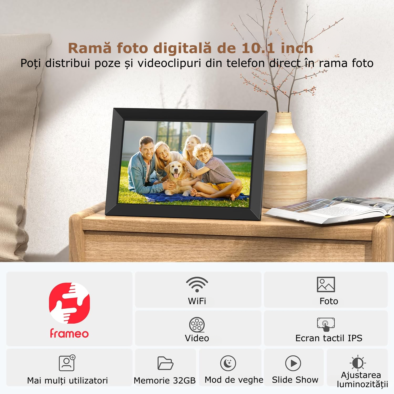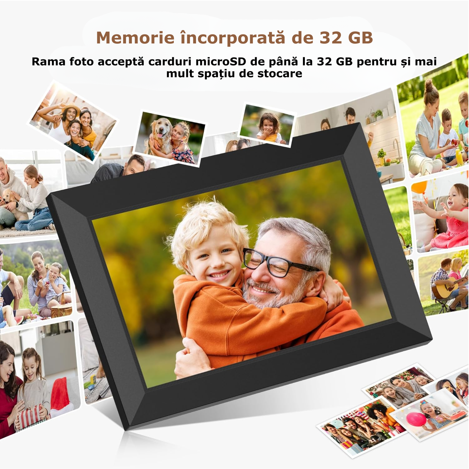 Rama Foto Digitala, Simply Joy, 10.1 inch, Wi-Fi, ecran tactil 1280 x 800 HD IPS, memorie interna 32GB, Slot USB, Card SD, Aplicatia Frameo,Difuzor 2x2W, Redare Poze si Video, Partajare Instantanee foto/video prin aplicatie, cadou ideal, Negru