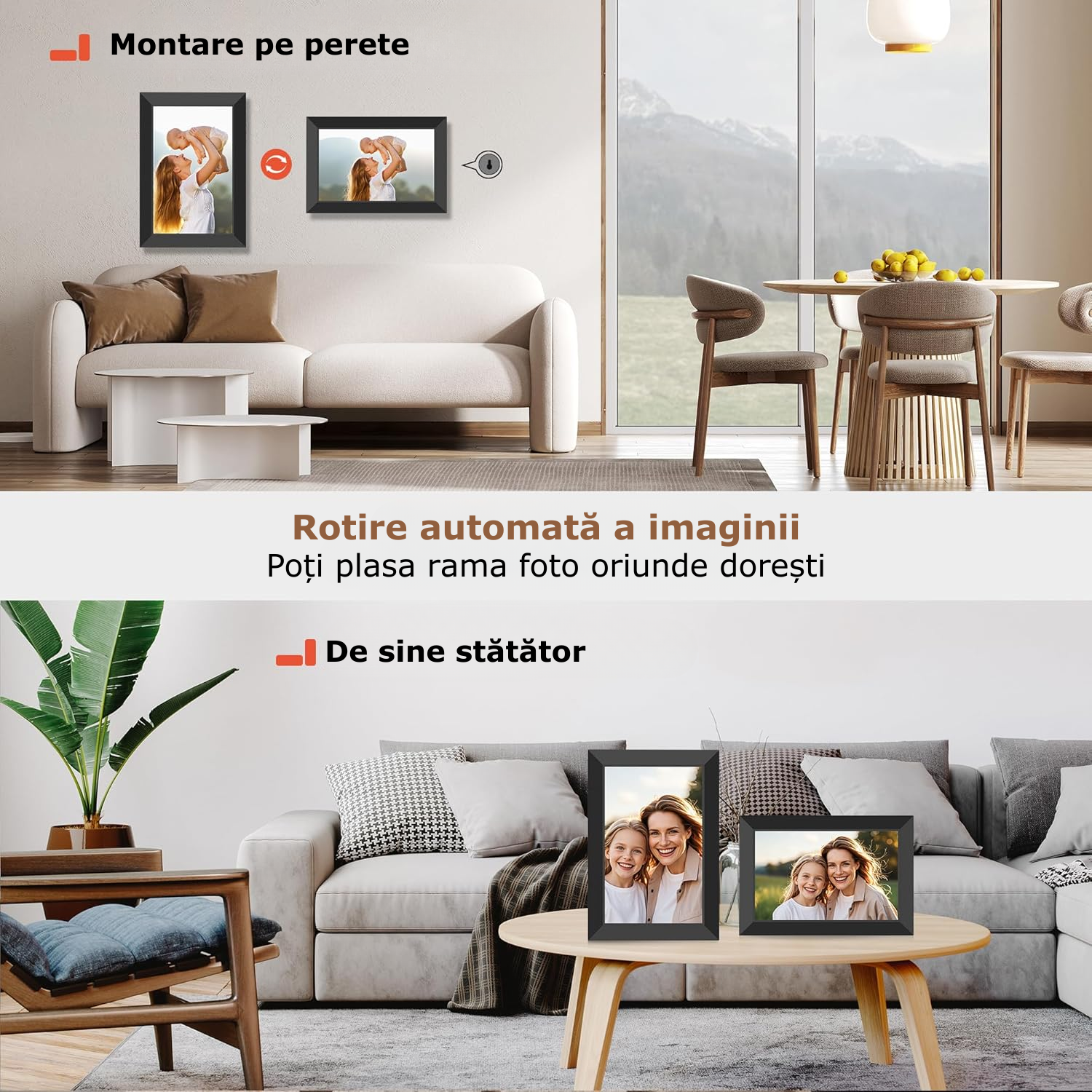 Design versatil: Rama foto digitala Frameo de 10.1 inch este proiectata avand in vedere flexibilitatea. Puteti alege sa o pozitionati orizontal sau vertical, in functie de aspectul camerei si de orientarea fotografiei. In plus, cadrul este echipat cu un suport pentru o plasare usoara pe birouri, mese sau rafturi. Daca preferati o nota mai decorativa, rama poate fi montata si pe perete, permitandu-va sa o agatati ca pe o rama traditionala.
