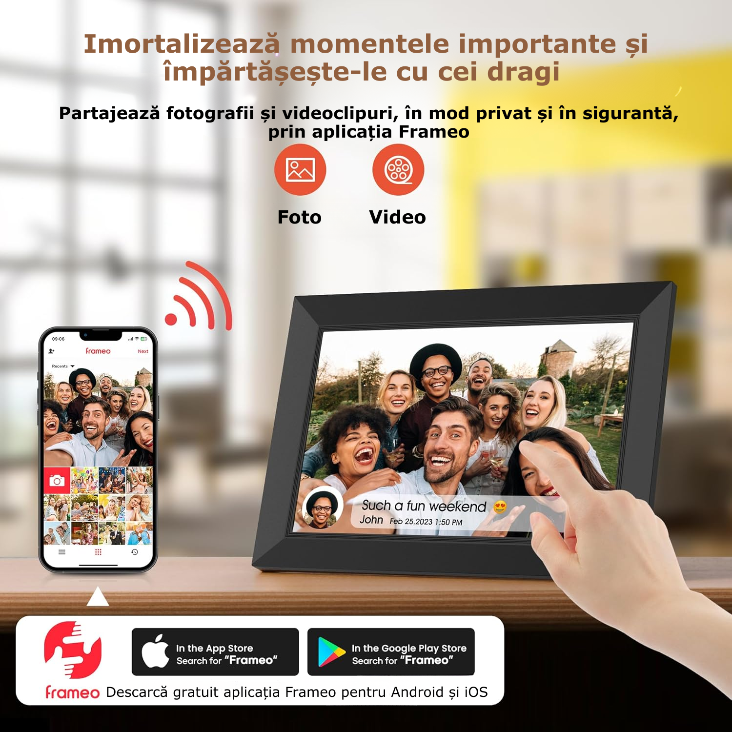 Partajare instantanee de fotografii si videoclipuri cu aplicatia Frameo: Una dintre caracteristicile remarcabile ale ramei foto digitale este capacitatea de a partaja fotografii si videoclipuri in timp real. Folosind aplicatia Frameo (disponibila atat pentru dispozitivele Android, cat si pentru iOS), puteti incarca si trimite cu usurinta fotografii sau videoclipuri in rama, de oriunde din lume.