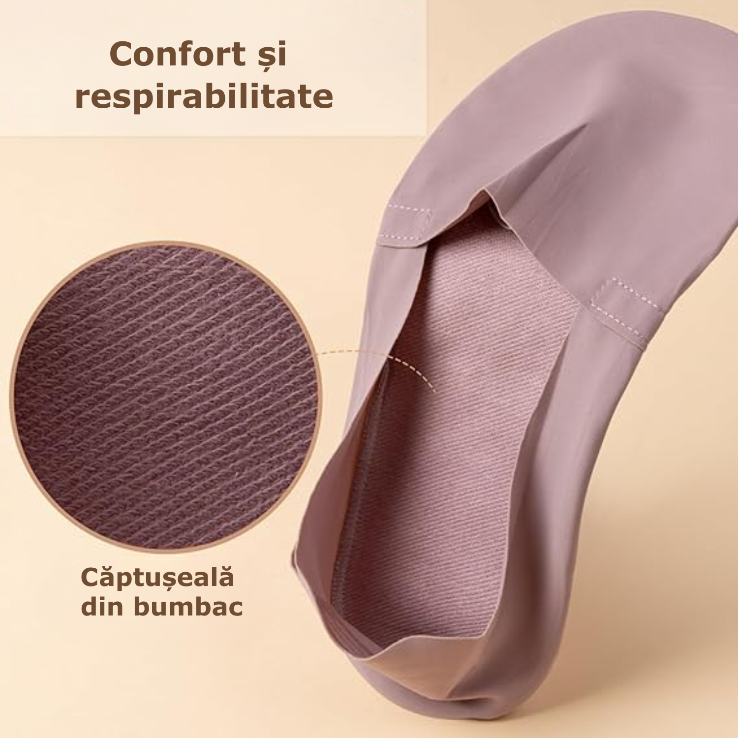 Baza anti-alunecare – Sosetele au benzi din silicon pe calcai si pe talpa pentru asigura ca acestea nu vor aluneca in timpul mersului. Aceste sosete fara captuseala sunt confortabile si elastice, se muleaza rapid pe picior.