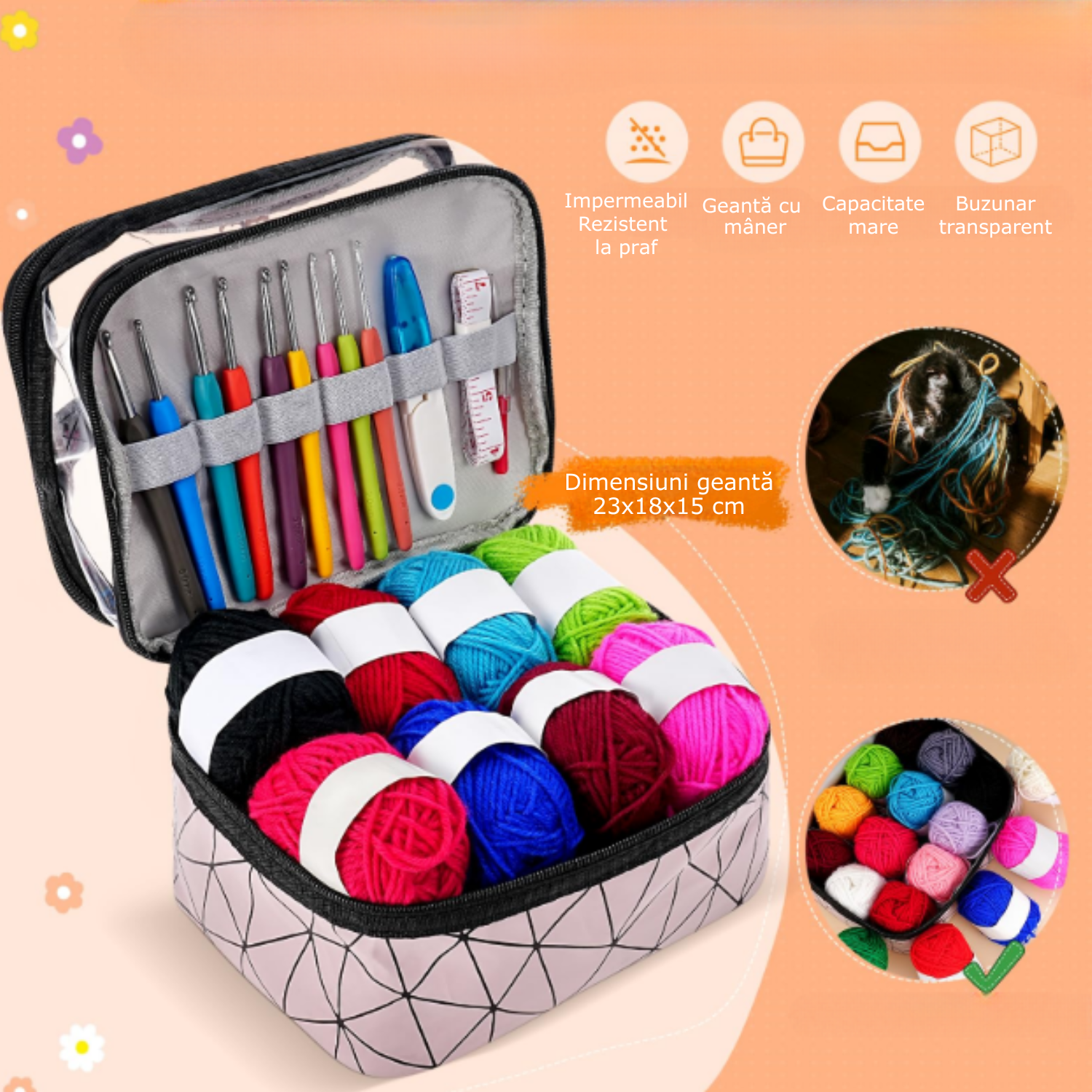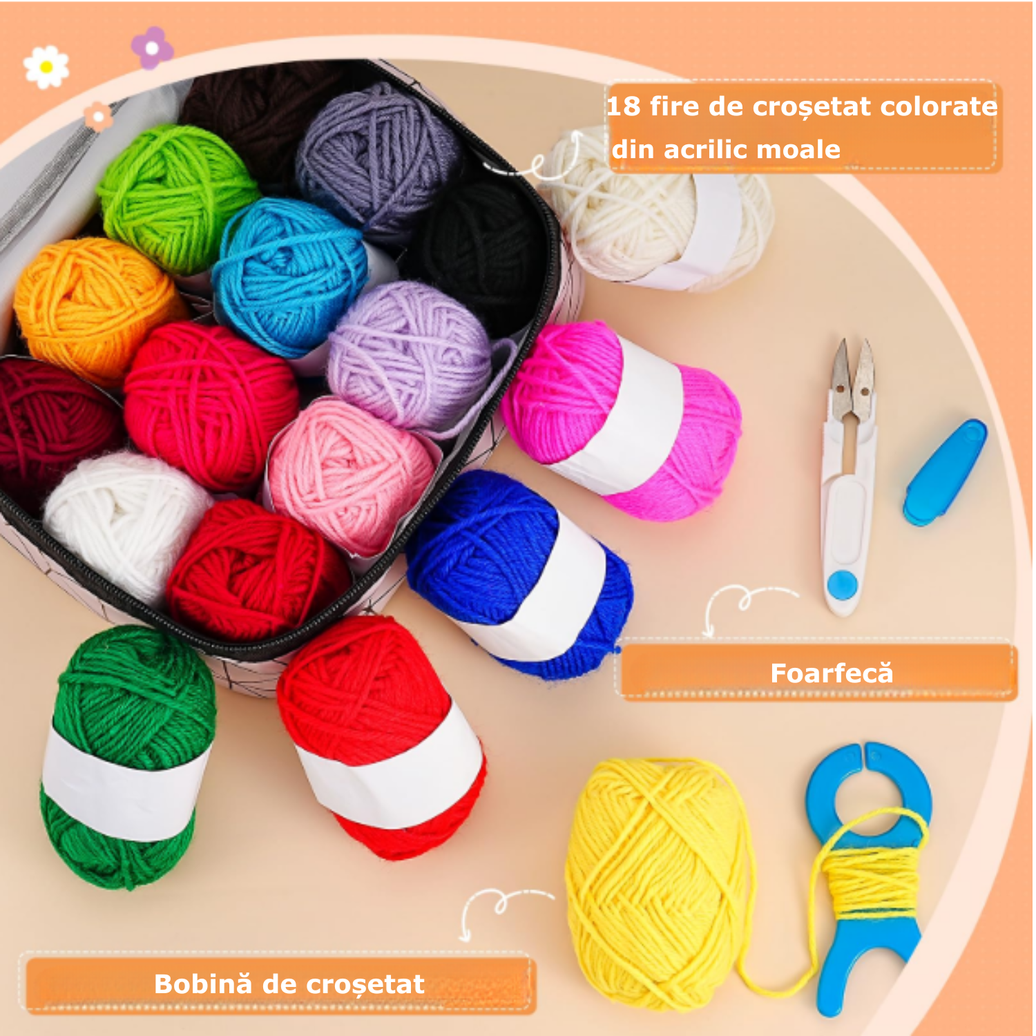 Set complet pentru tricotat si crosetat: Setul nostru de crosetat are 105 piese si include: 18 fire de crosetat in culori diferite (25g fiecare), 16 crosete din aluminiu de dimensiuni mici (dimensiunea 0,6 mm – 3 mm), 9 crosete ergonomice cu maner moale din silicon (dimensiunea 2 mm – 6 mm), 20 marcatori cu clips, 15 inele marcatoare, 10 ace cu ochi mare, 4 ace in forma de U, 3 ace curbate, 2 ace de prindere, 2 contre, o foarfeca, un metru de croitorie, o bobina de crosetat, o rigla de croitorie, un descurcator. Toate accesoriile de tricotat sunt ambalate intr-o cutie de depozitare portabila.