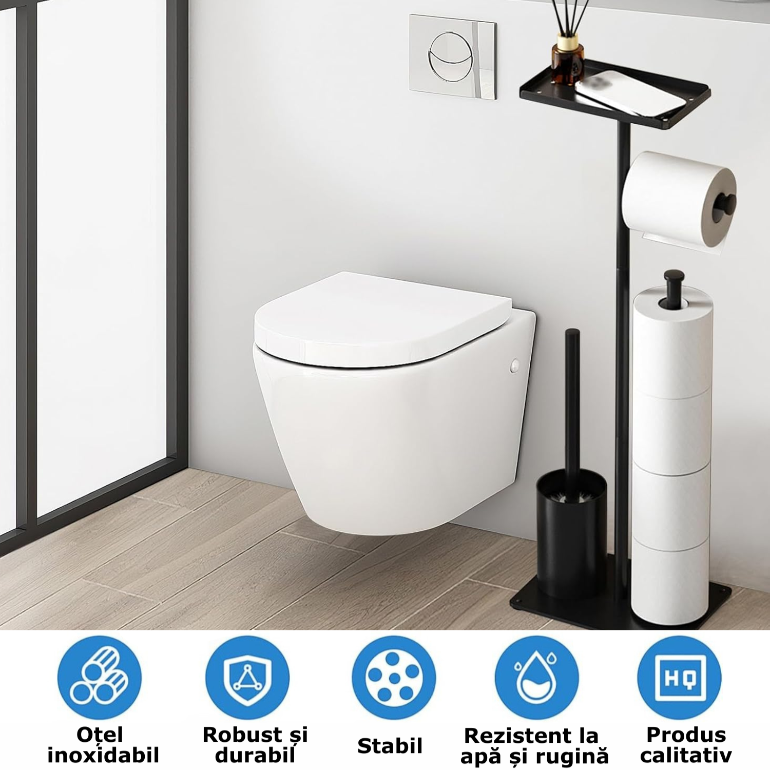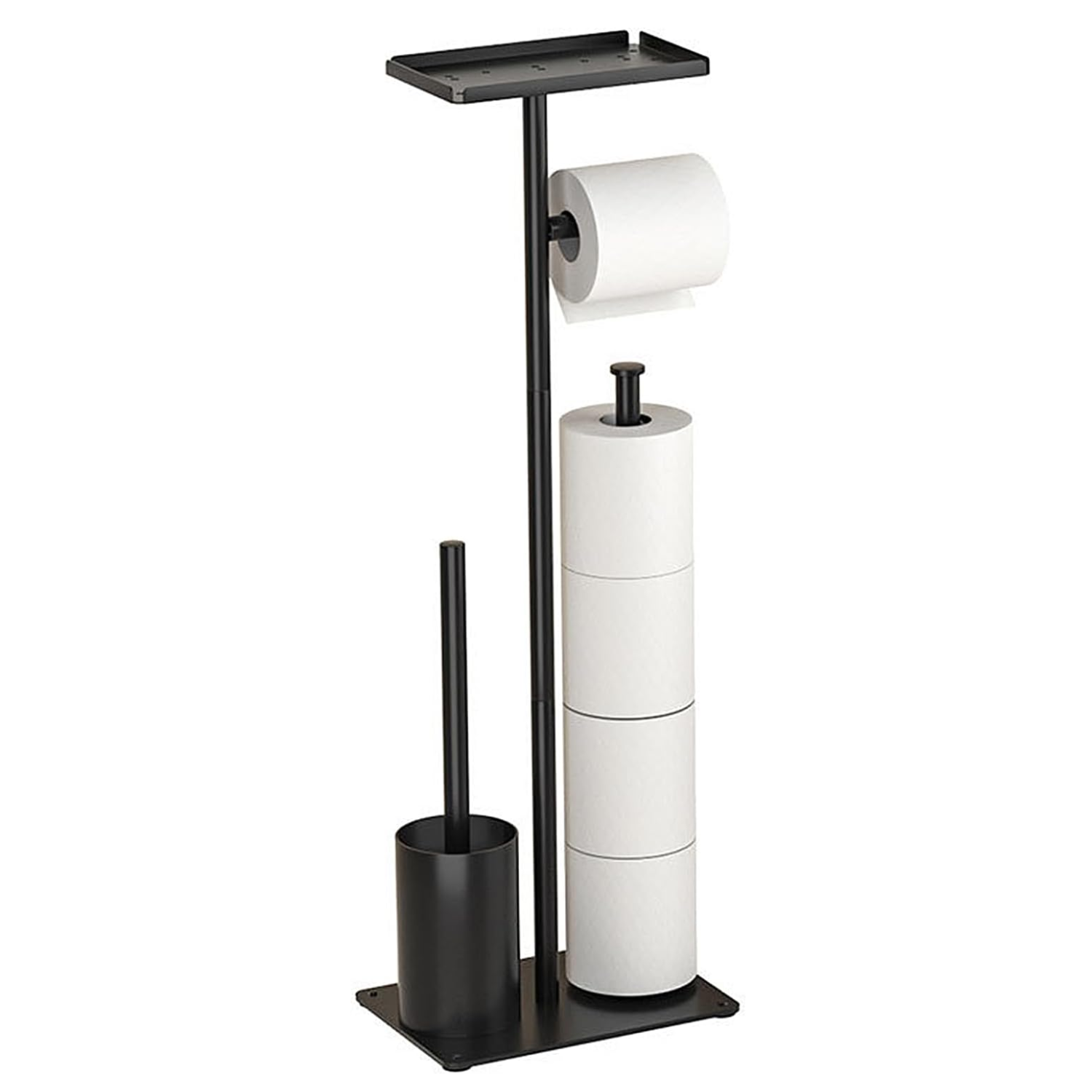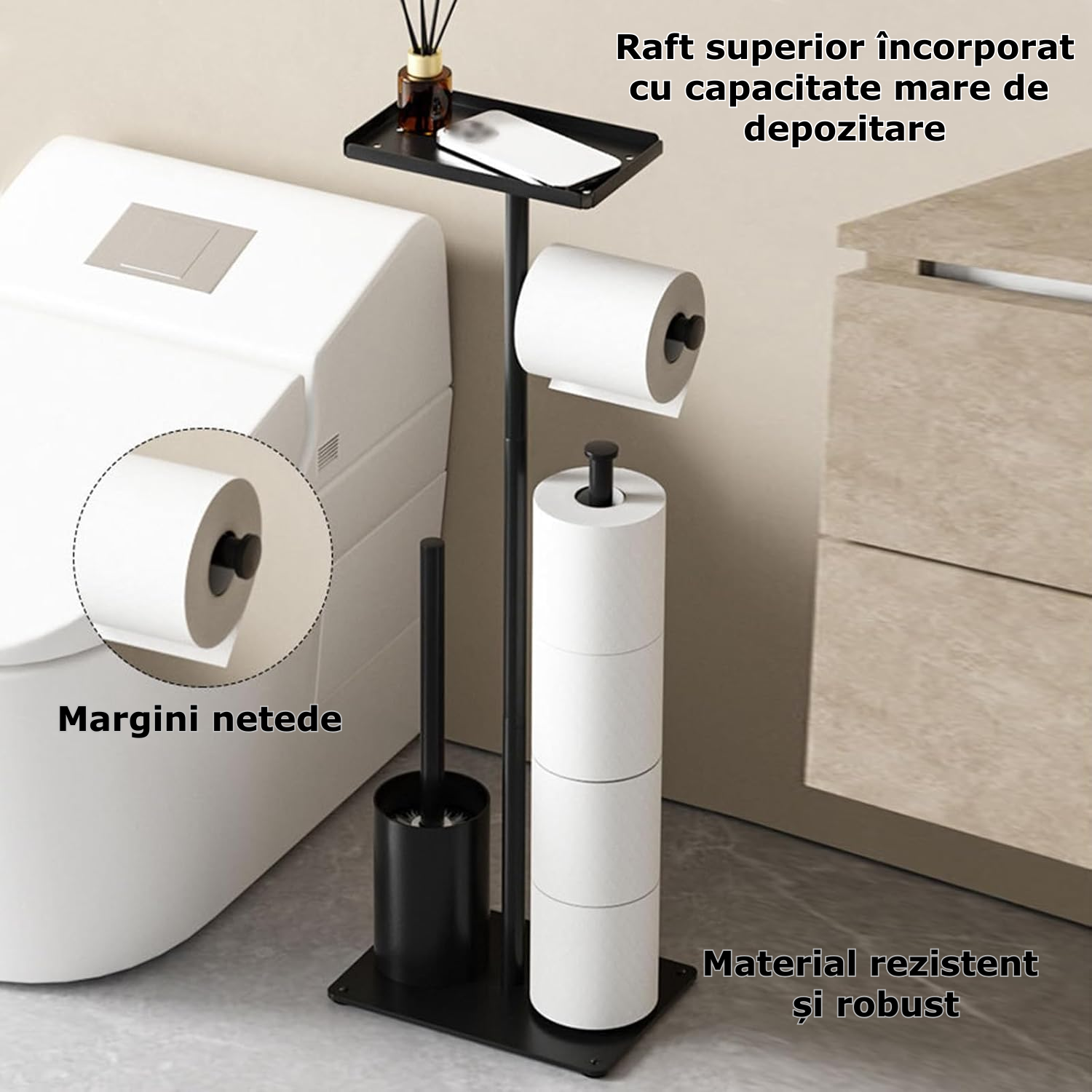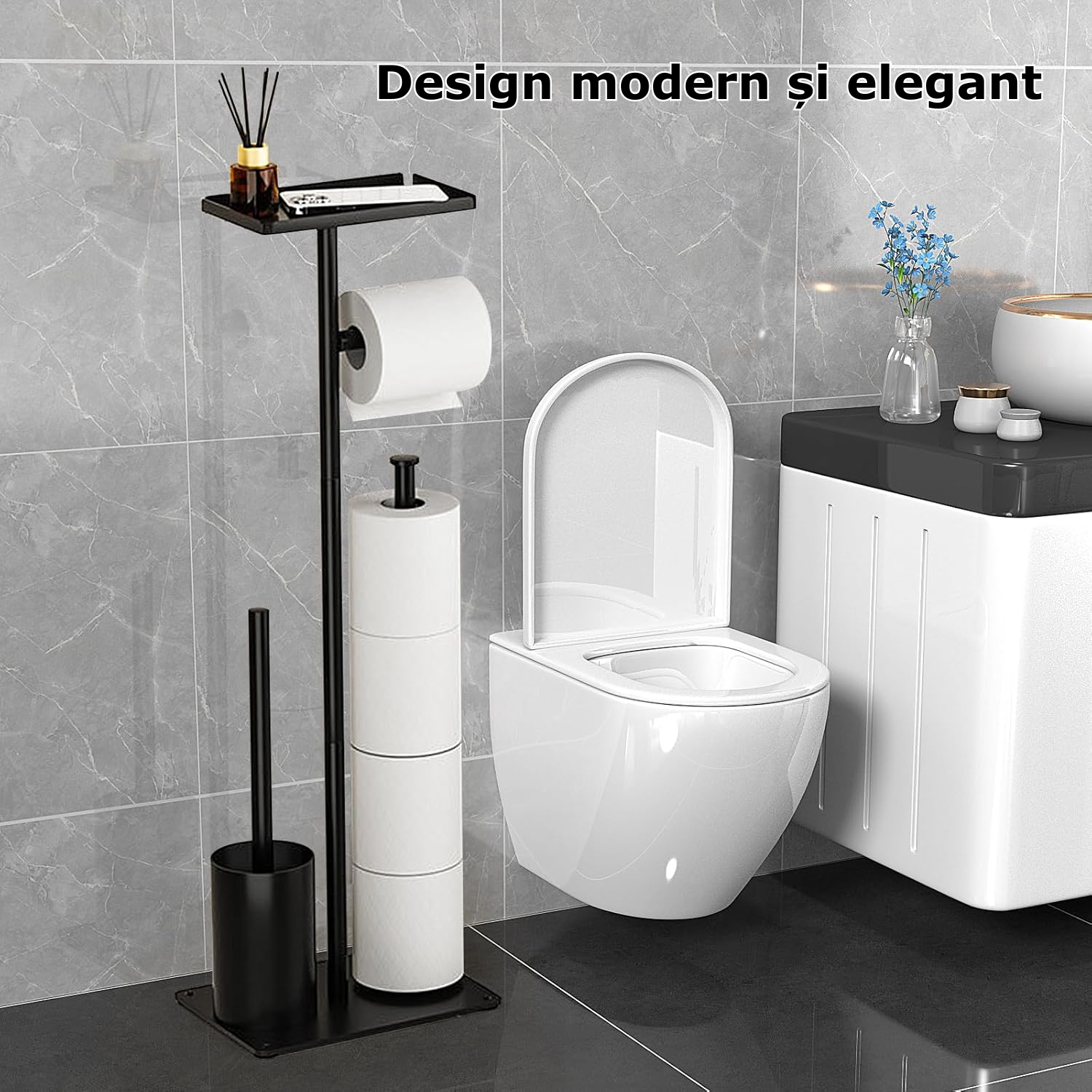 Suport 4 in 1 pentru hartia igienica cu perie de toaleta Simply Joy®, Design Modern, Multifunctional cu Cutie de Depozitare, spatiu pentru 4 role de hartie, perie WC, Otel inoxidabil, Negru