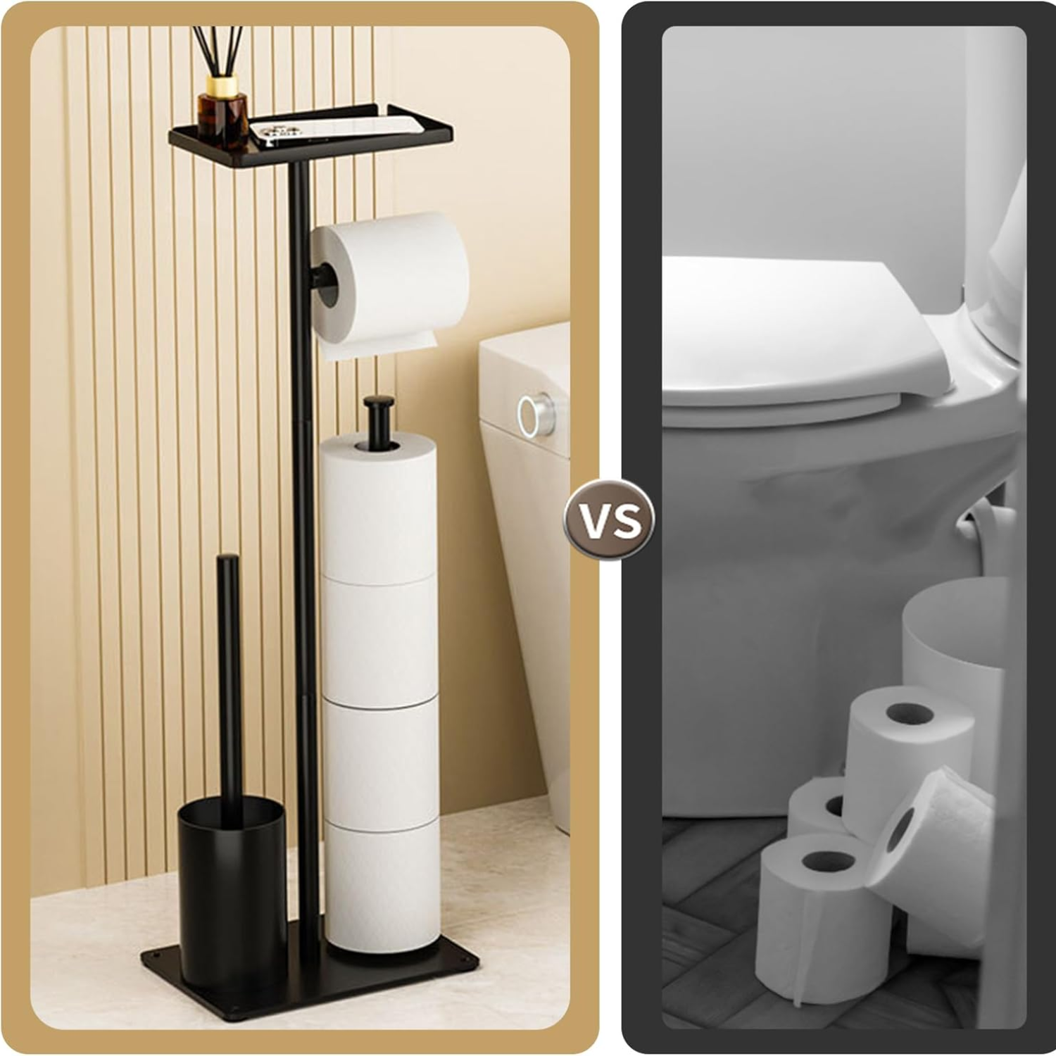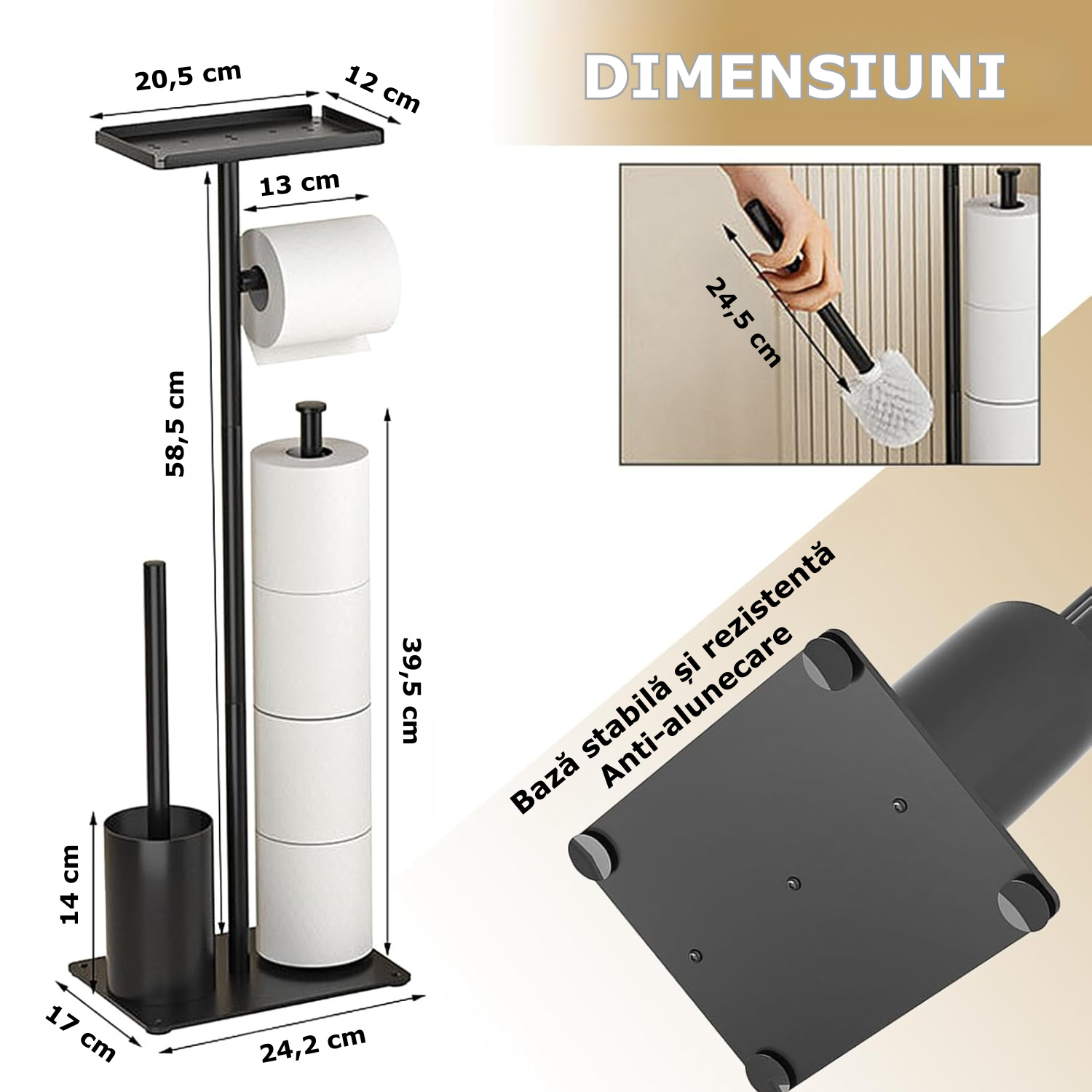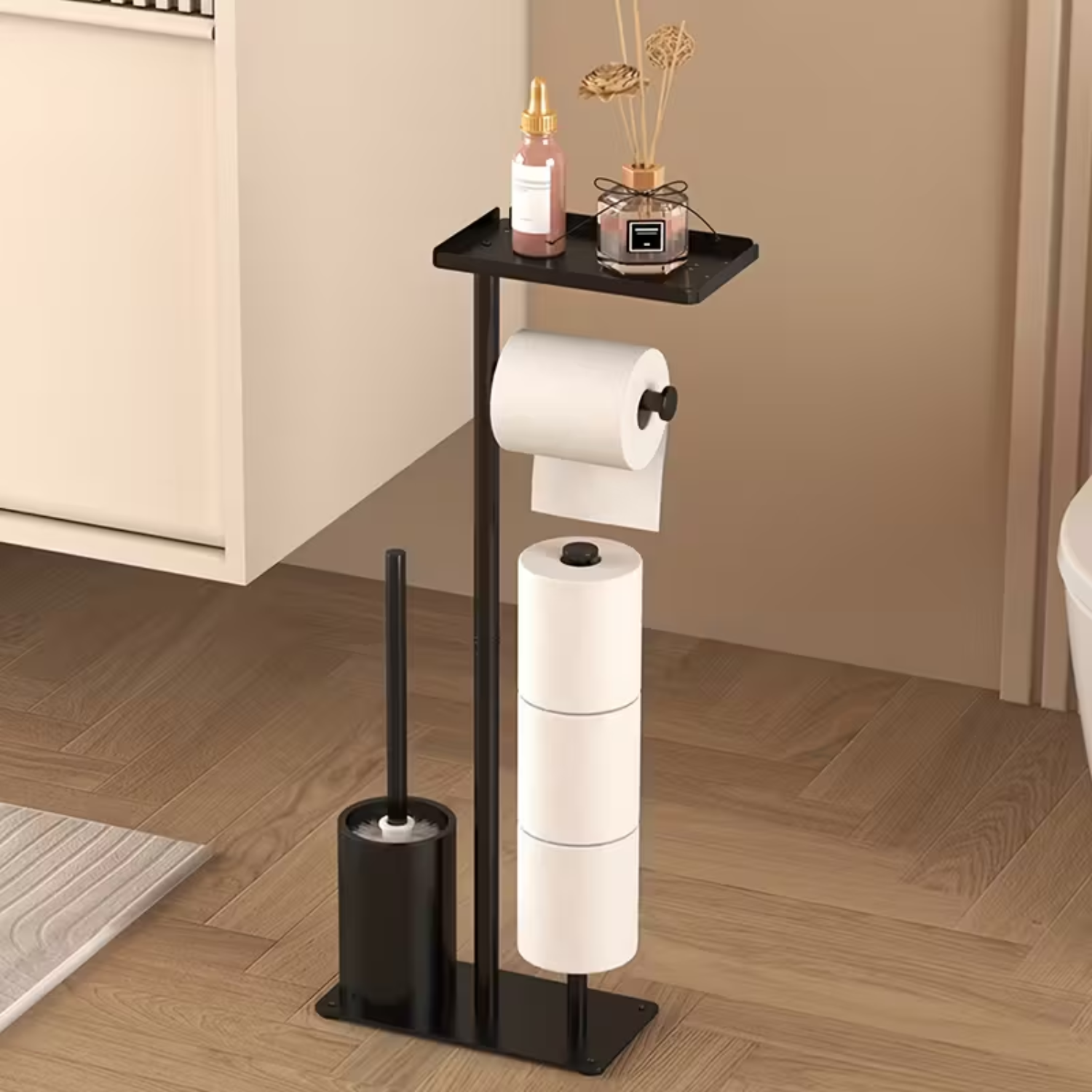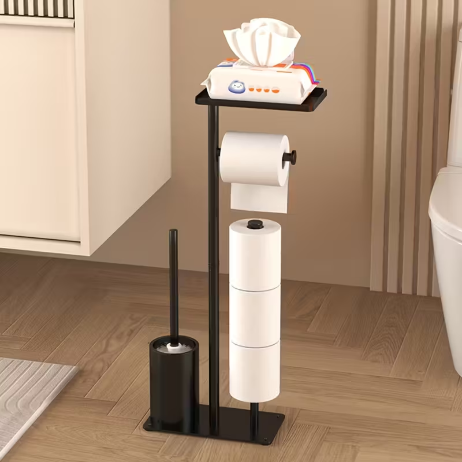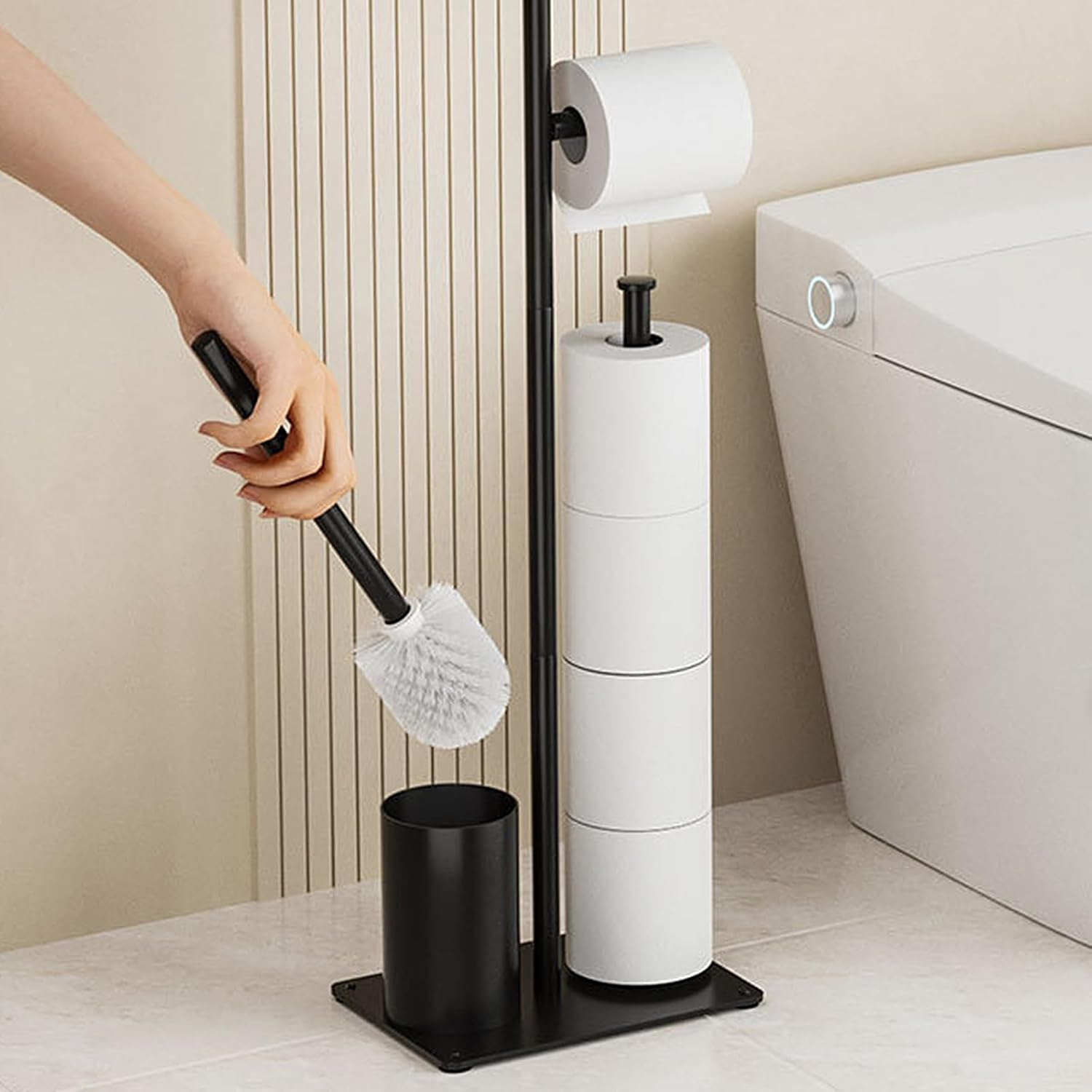 Suport 4 in 1 pentru hartia igienica cu perie de toaleta Simply Joy®, Design Modern, Multifunctional cu Cutie de Depozitare, spatiu pentru 4 role de hartie, perie WC, Otel inoxidabil, Negru