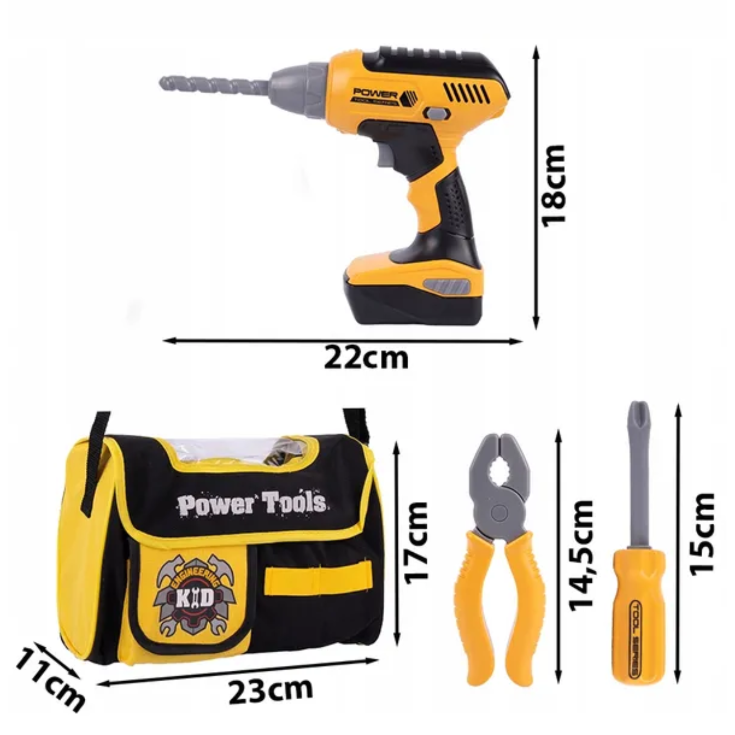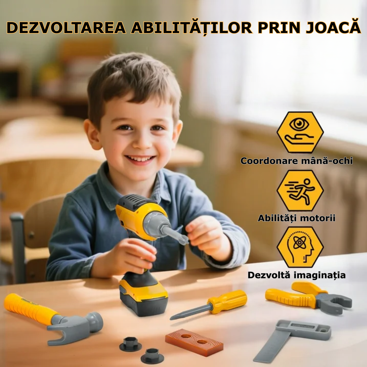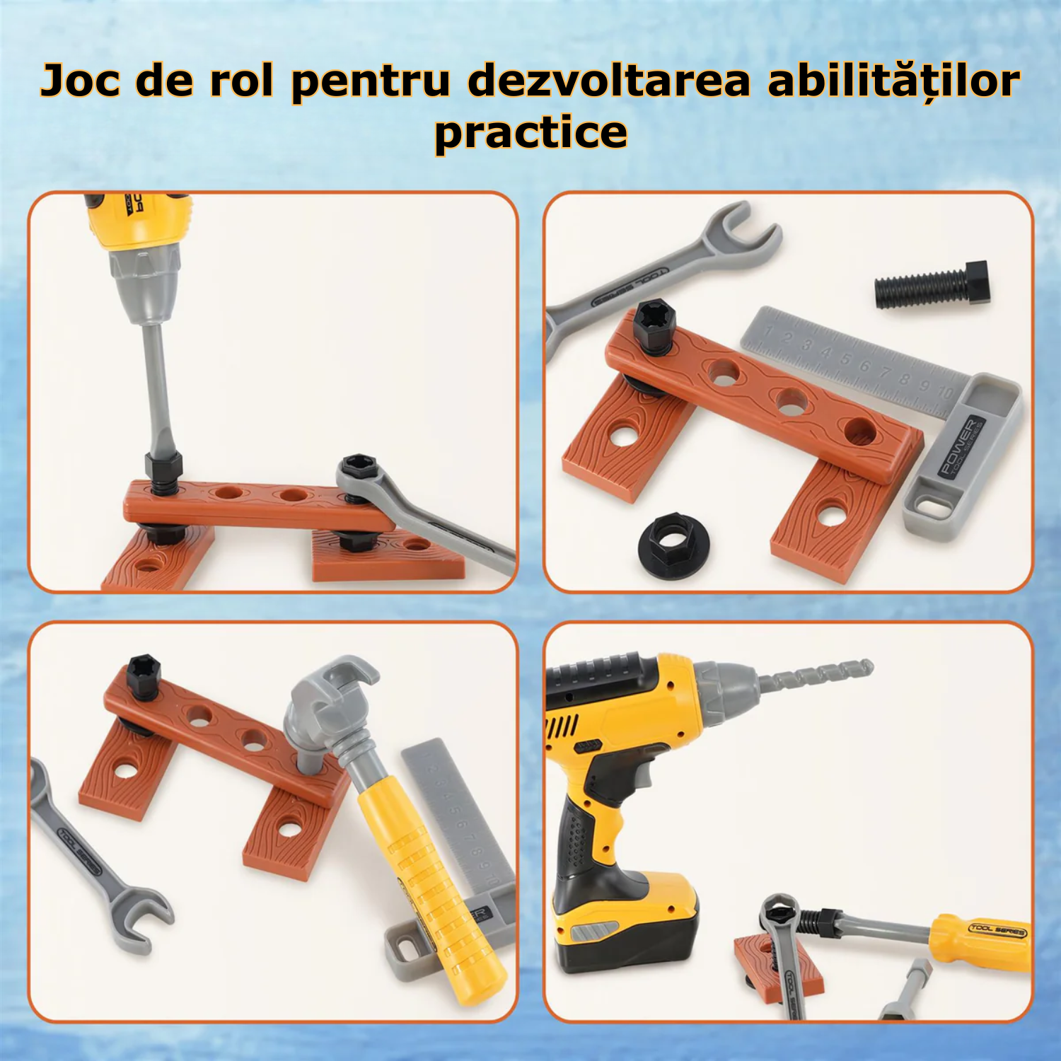 Material durabil si sigur - Acest set de ustensile de lucru pentru copii este fabricat din plastic durabil, sigur si ecologic. Toate uneltele sunt concepute special pentru copii, cu margini rotunjite si suprafate netede, iar viteza de rotatie a bormasinei este lenta si constanta, pentru a asigura siguranta si confort in timpul jocului.