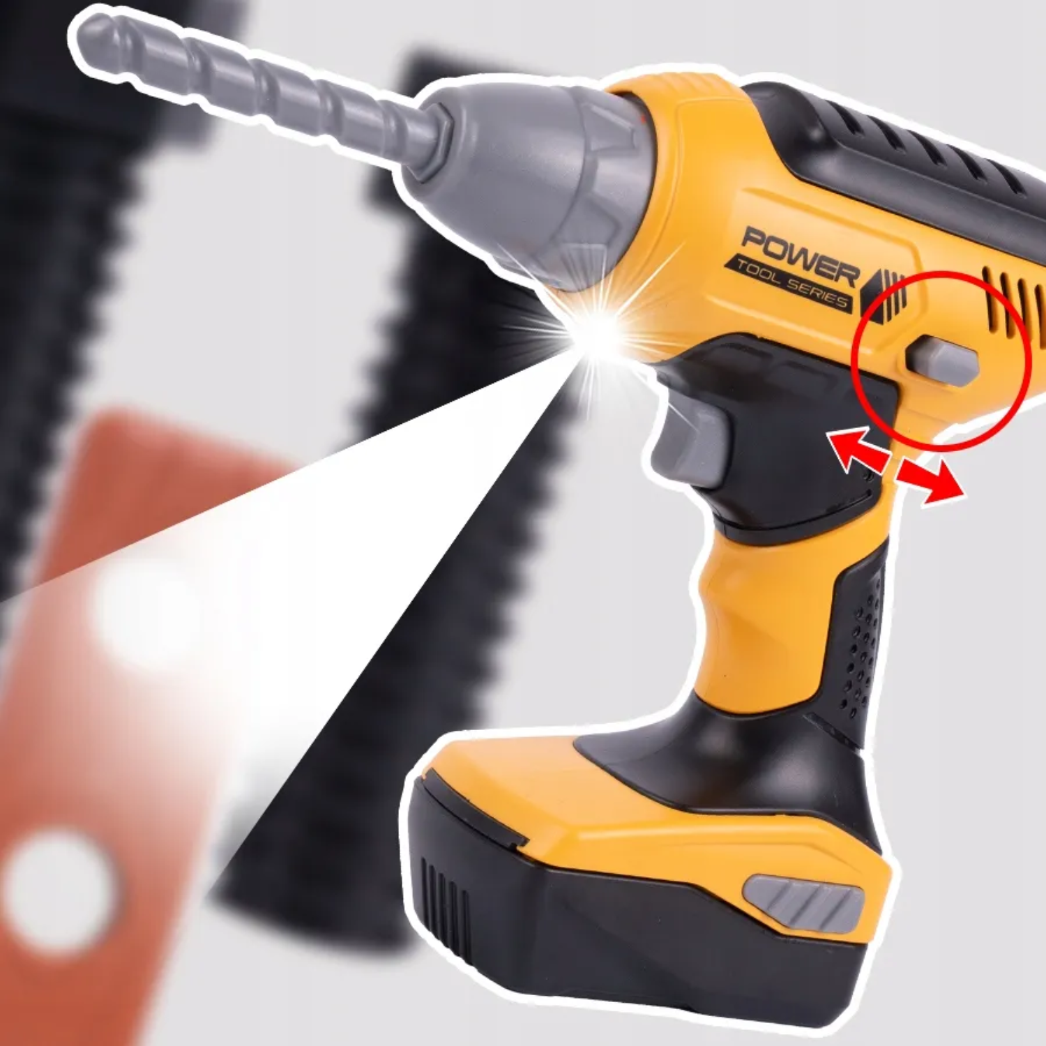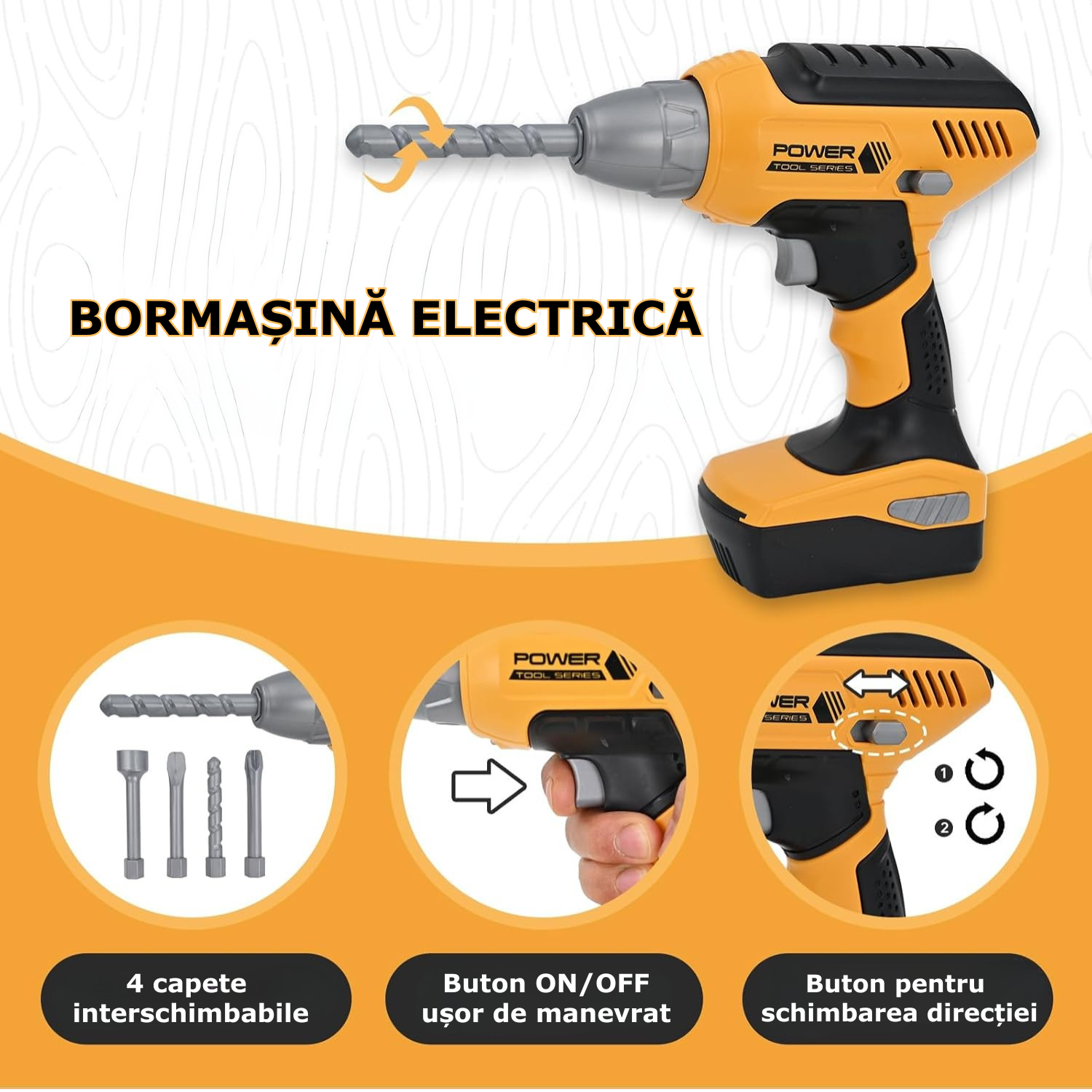 Set de unelte de lucru cu bormasina electrica - Burghiul de jucarie vine cu 4 capete interschimbabile pe care copiii le pot inlocui cu usurinta dupa cum le este necesar; masina de gaurit este alimentata cu baterii si se roteste in sensul acelor de ceasornic/in sensul invers acelor de ceasornic si are sunete realiste, acumulatorul detasabil al bormasinei il face si mai realist pentru copilul dumneavoastra. Este un kit complet de scule si unelte de lucru ce ii poate tine ocupati ore intregi pe cei mici !