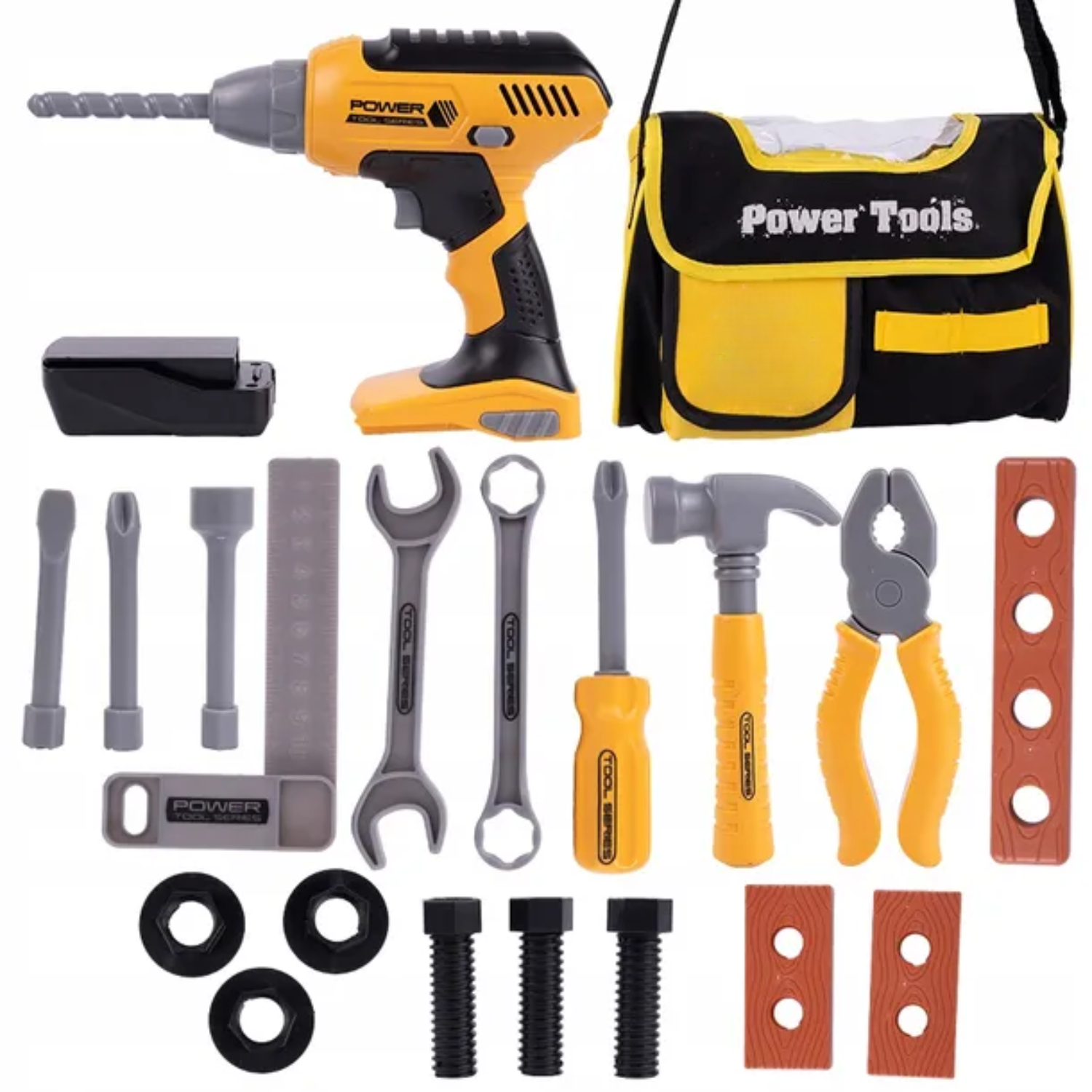 Set complet de ustensile de lucru pentru copii - Acest kit de constructii include tot ce are nevoie micutul tau pentru a juca rolul unui inginer sau muncitor constructor. Setul include un burghiu electric alimentat cu baterii, surubelnita, ciocan de jucarie, patent de jucarie, suruburi, chei, piulite, rigla si blocuri de lemn.