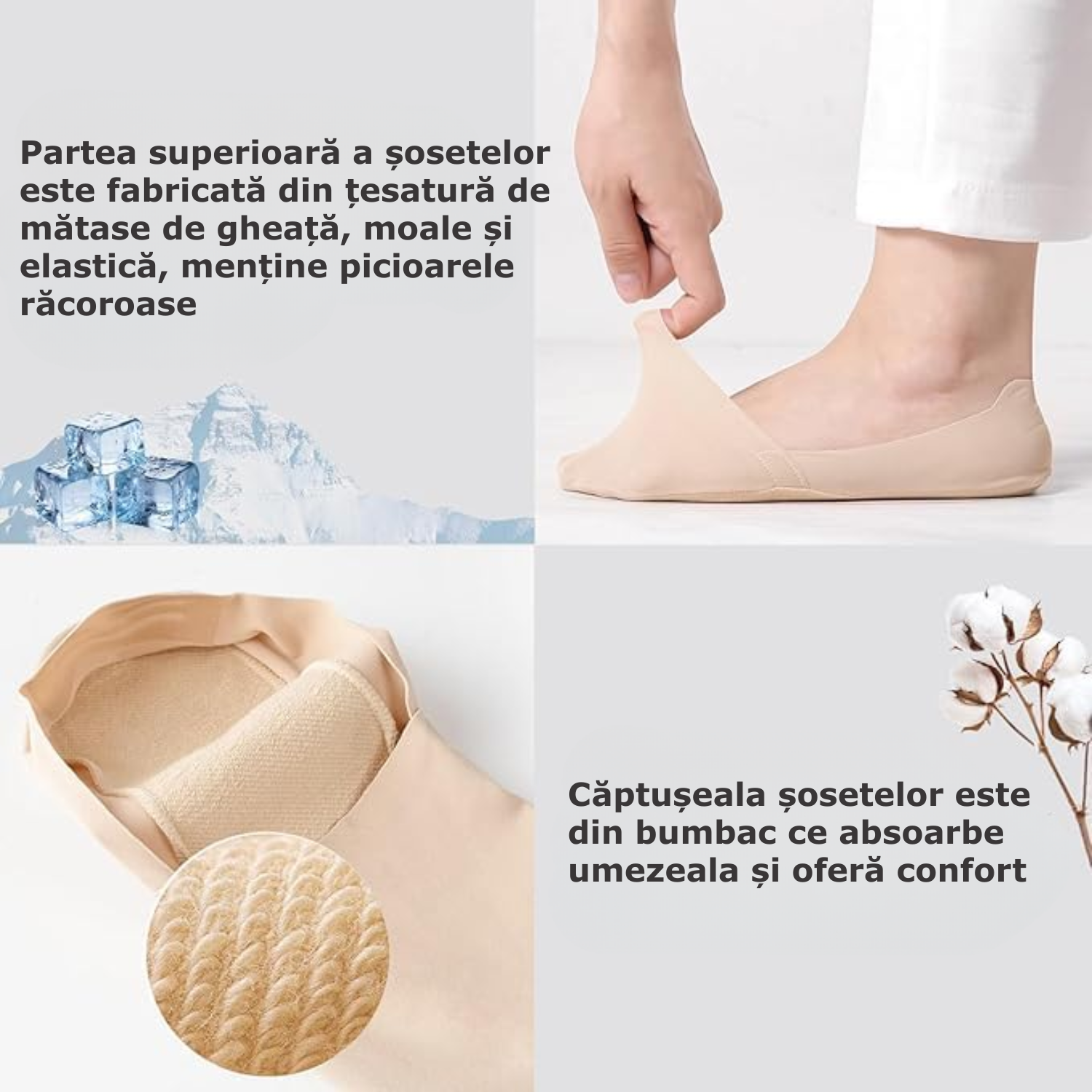 Baza anti-alunecare – Sosetele au benzi din silicon pe calcai si pe talpa pentru asigura ca acestea nu vor aluneca in timpul mersului. Aceste sosete fara captuseala sunt confortabile si elastice, se muleaza rapid pe picior.