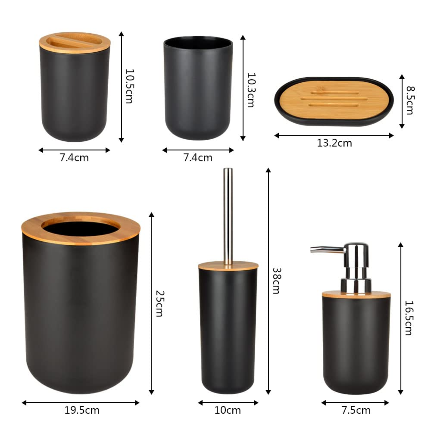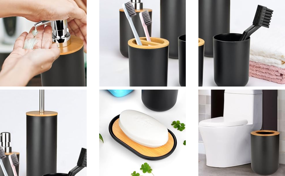 Set Accesorii Baie Premium din Bambus Simply Joy, Set 6 piese, design modern, Cos de Gunoi, Dozator de Sapun Lichid, Pahar Pentru Periuta Dinti, Savoniera, Perie Wc cu Suport, Pahar, Organizator baie complet, Negru