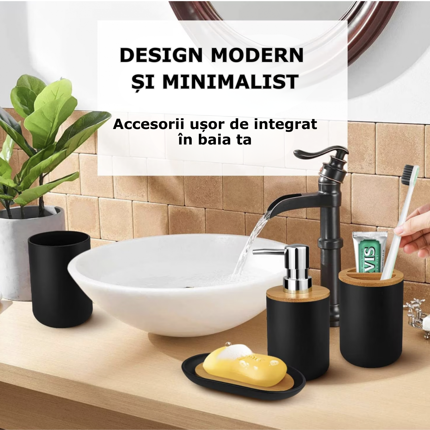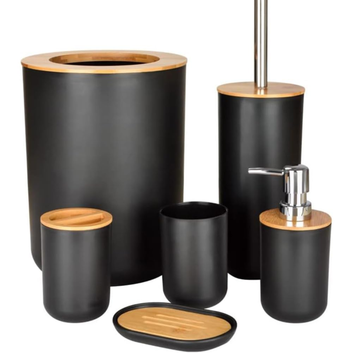 Transforma orice baie intr-un spatiu elegant si functional cu acest set complet de accesorii pentru baie, 6 piese, realizat din materiale durabile – plastic rezistent si bambus natural pentru un aspect modern si rafinat.