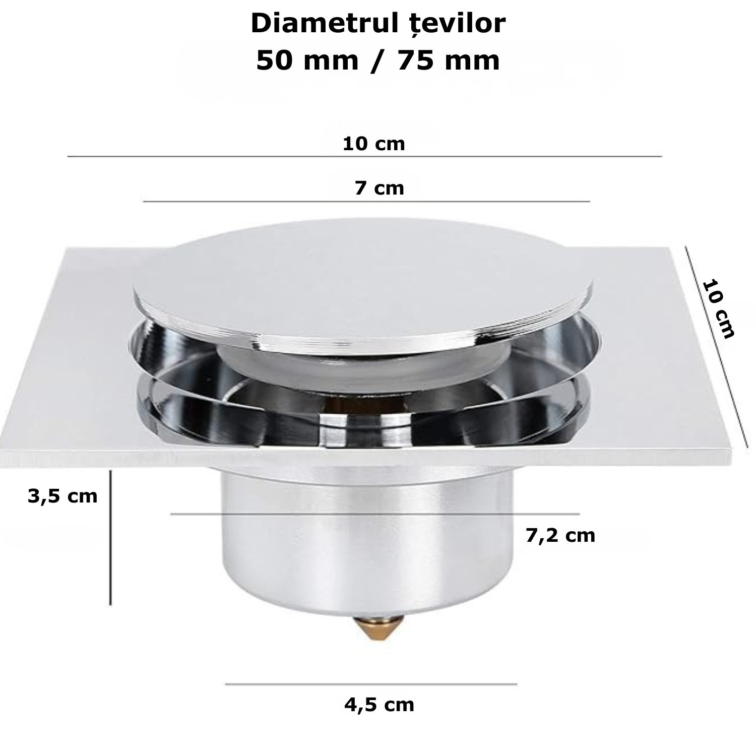 Sifonul are dimensiunea de 10x10 cm, este compatibil cu tevi de 50 mm si 75 mm, fiind potrivit pentru 99% din case.
