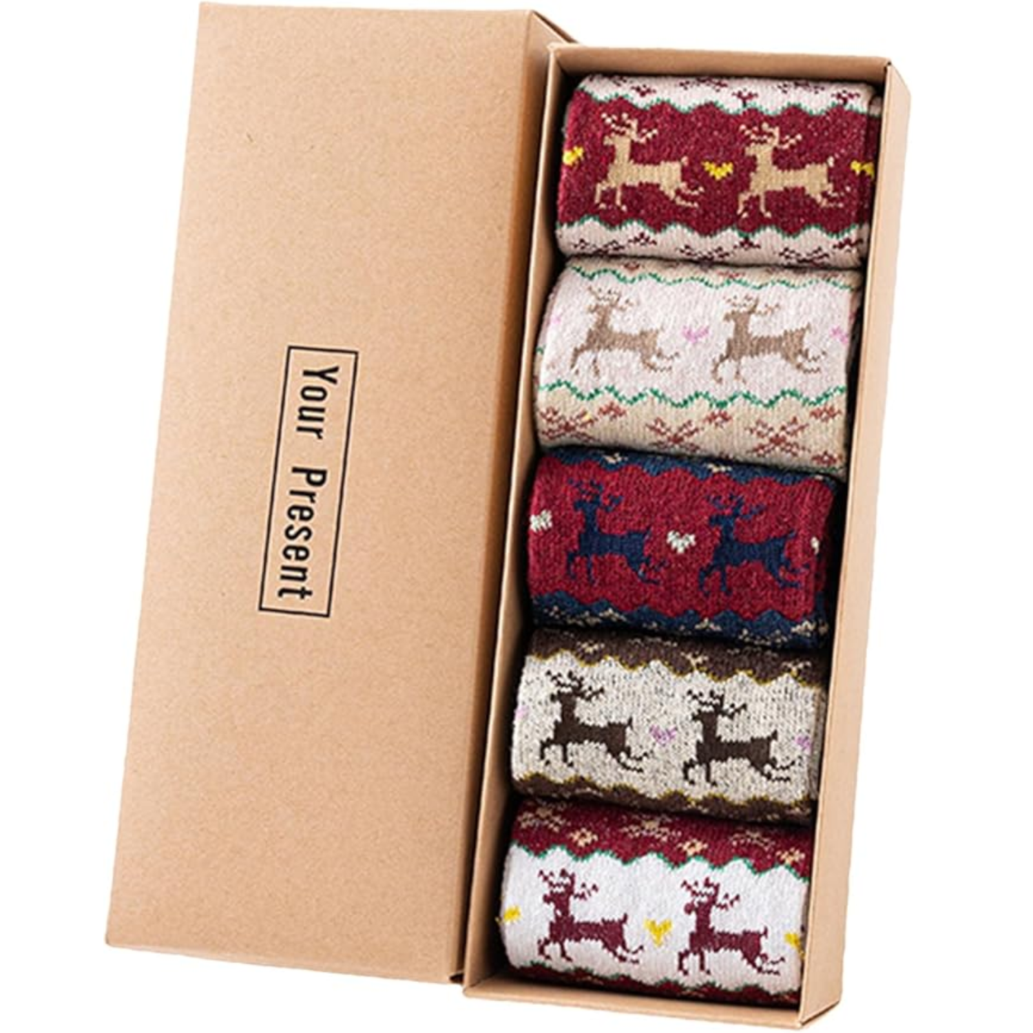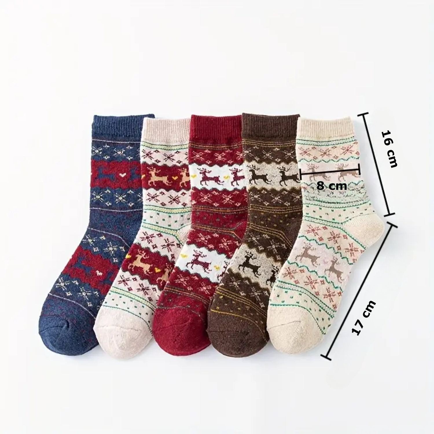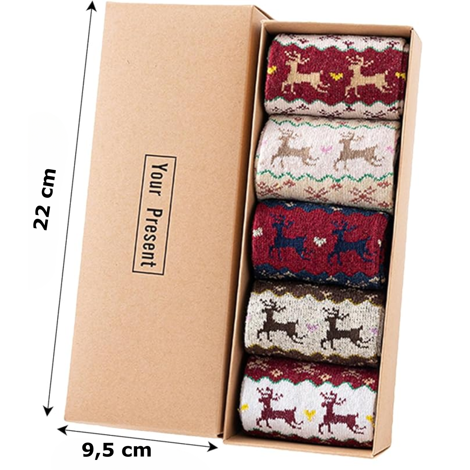 Sosete dama, set 5 perechi de sosete tricotate, model calduros cu imprimeu cu reni pentru femei, Marime 36 - 41, Sosete confortabile de iarna pentru femei, cutie cadou, ziua de nastere, Craciun, Anul Nou