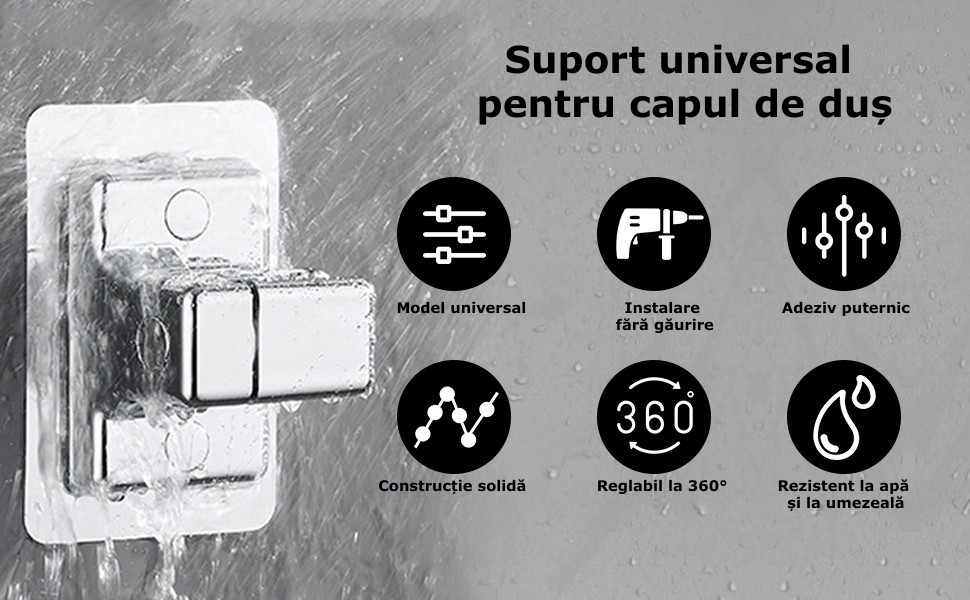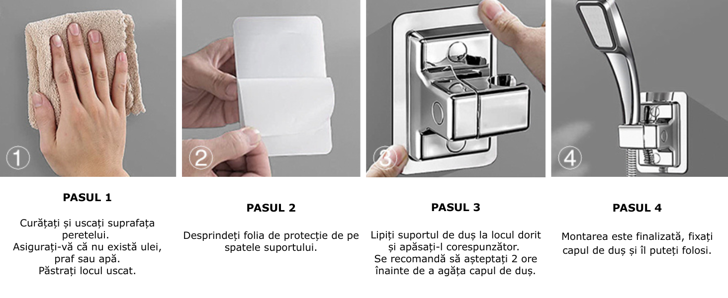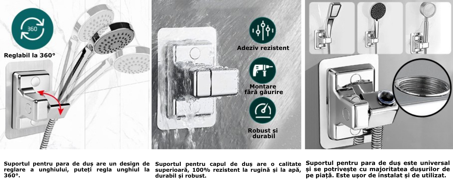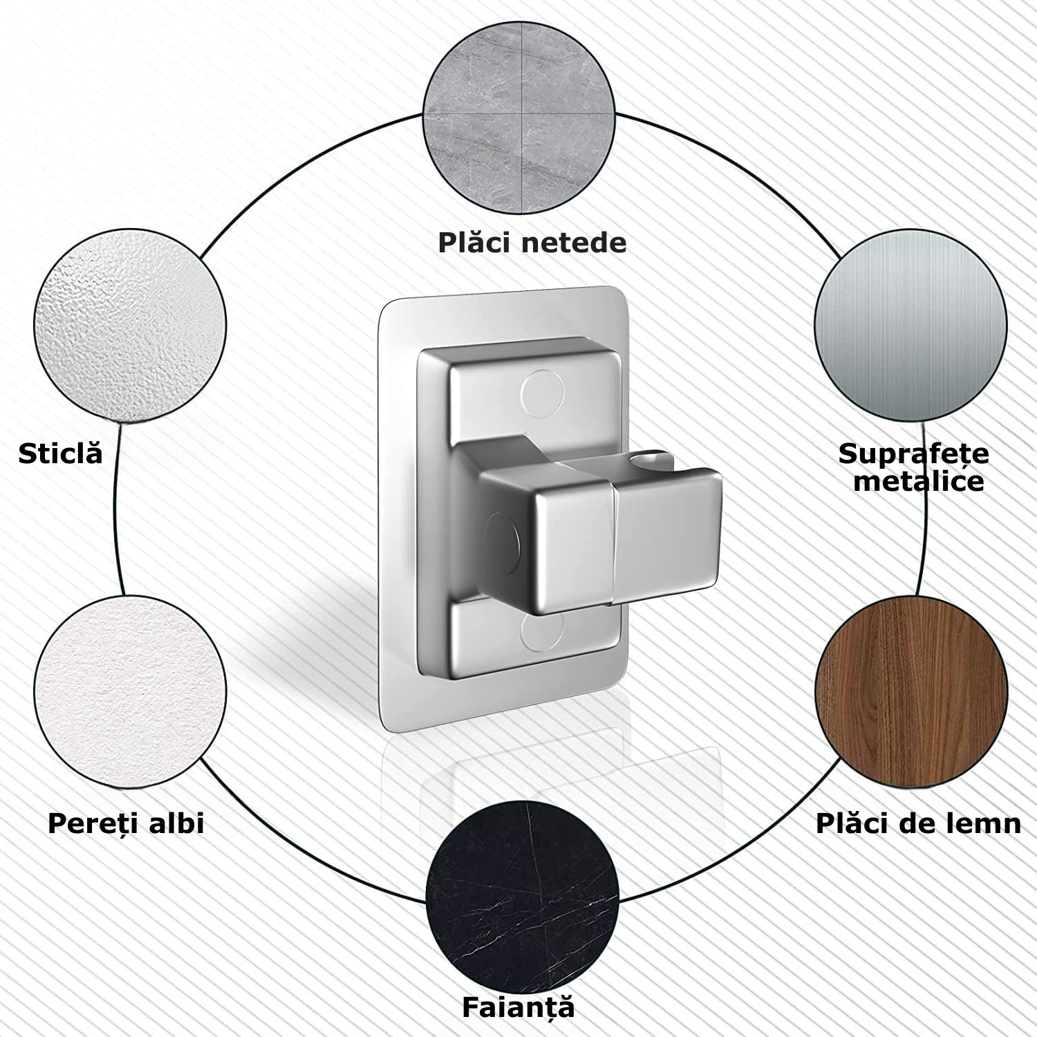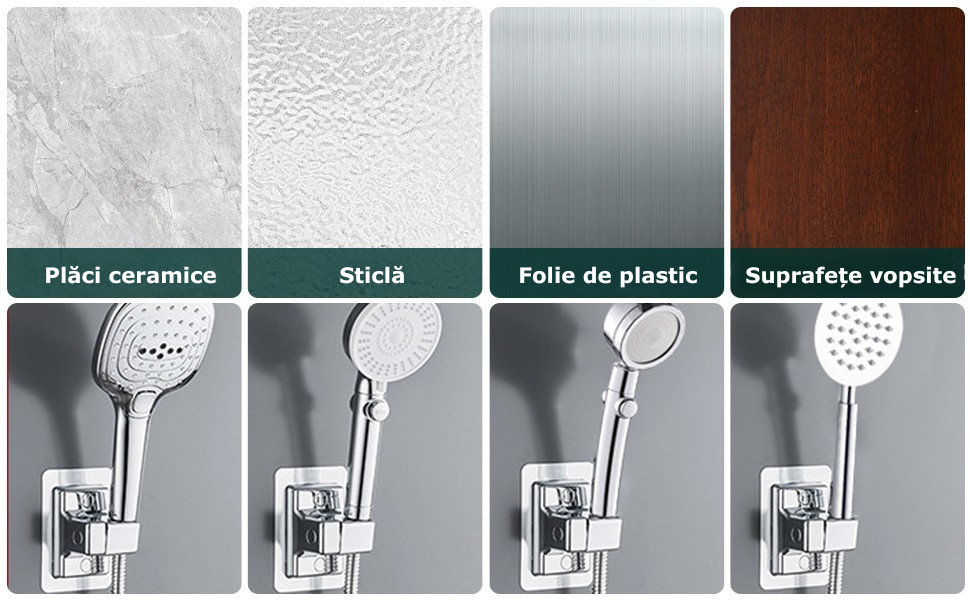 Nota: Suportul nostru pentru capul de dus este potrivit pentru toate tipurile de suprafete netede: pereti netezi, marmura, sticla.