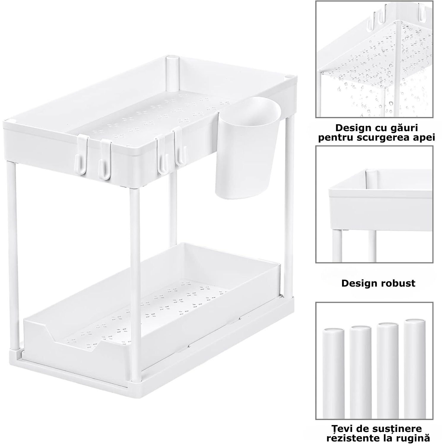 Organizator Extensibil Sub Chiuveta,Simply Joy®, Cu sertar Glisant si 4 Carlige, pentru Bucatarie si Baie, Design Modern, Usor de instalat,Material metal si ABS Premium, Rezistente, Durabile, Capacitate Mare Depozitare, Alb