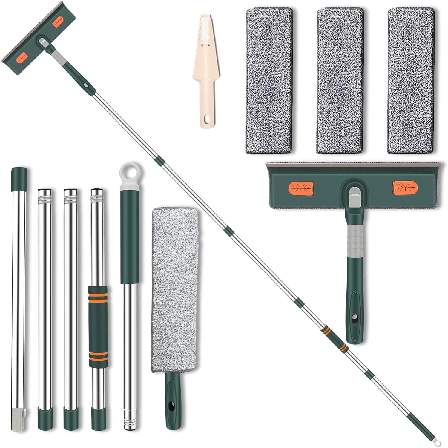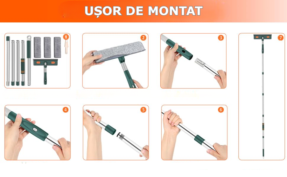 Set complet de curatare pentru geamuri: Setul include 1 racleta pentru geamuri din silicon, 1 perie aspra din microfibra, 5 tije de extensie, 3 lavete reutilizabile din microfibra (delicate cu suprafetele si cu functie excelenta de absorbtie a apei) si 1 mini-perie (razuiti excesul de apa si mizerie de pe geamuri), facandu-l un curatator perfect pentru geamuri.