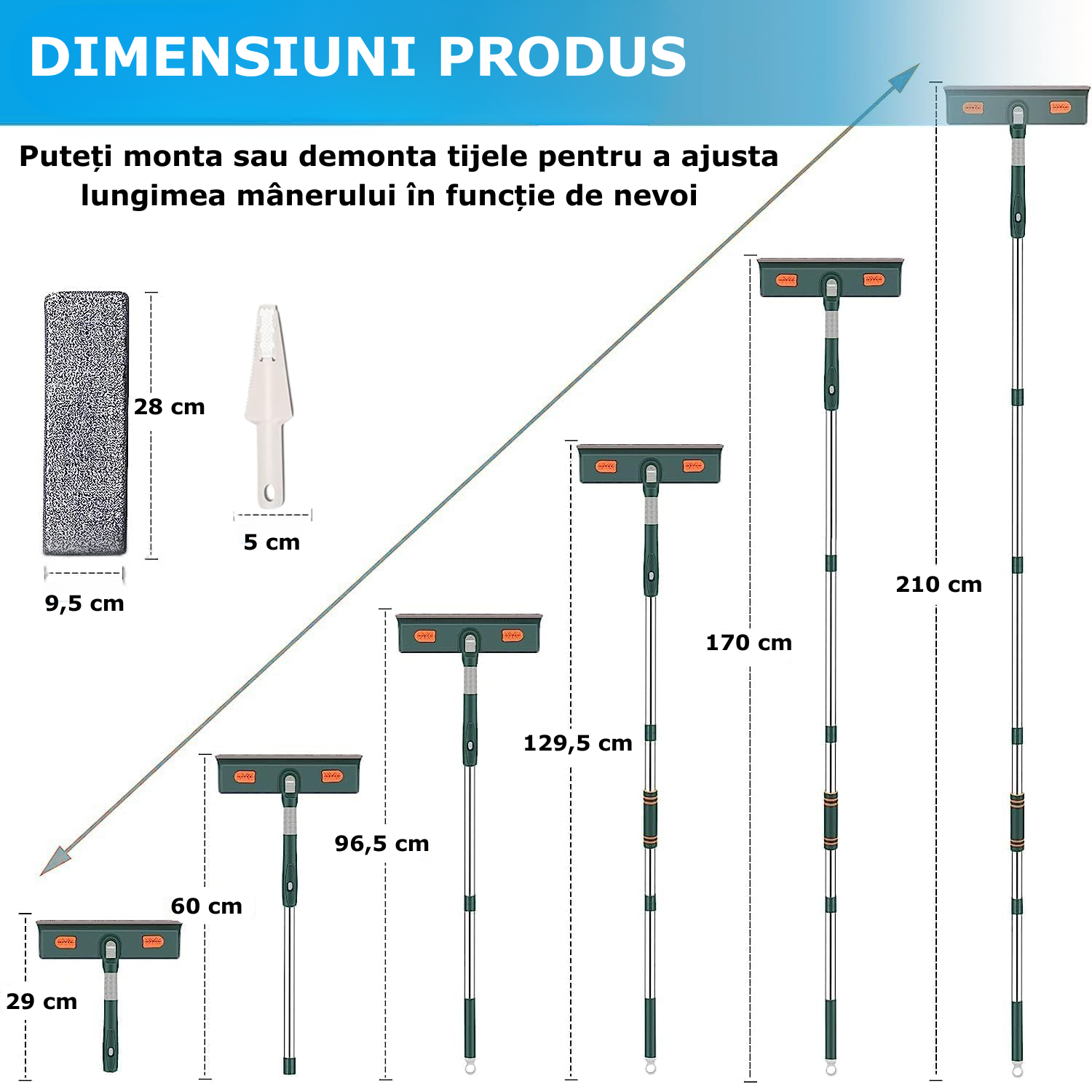 Stergator de geamuri telescopic multifunctional, Simply Joy, 2 in 1, Ajustabil, 29-210 cm, cu 3 lavete din microfibra, racleta pentru geamuri, Design Ergonomic, Usor de Utilizat, Rotativ la 180°, pentru geamuri, gresie, faianta sau podea, casa noua