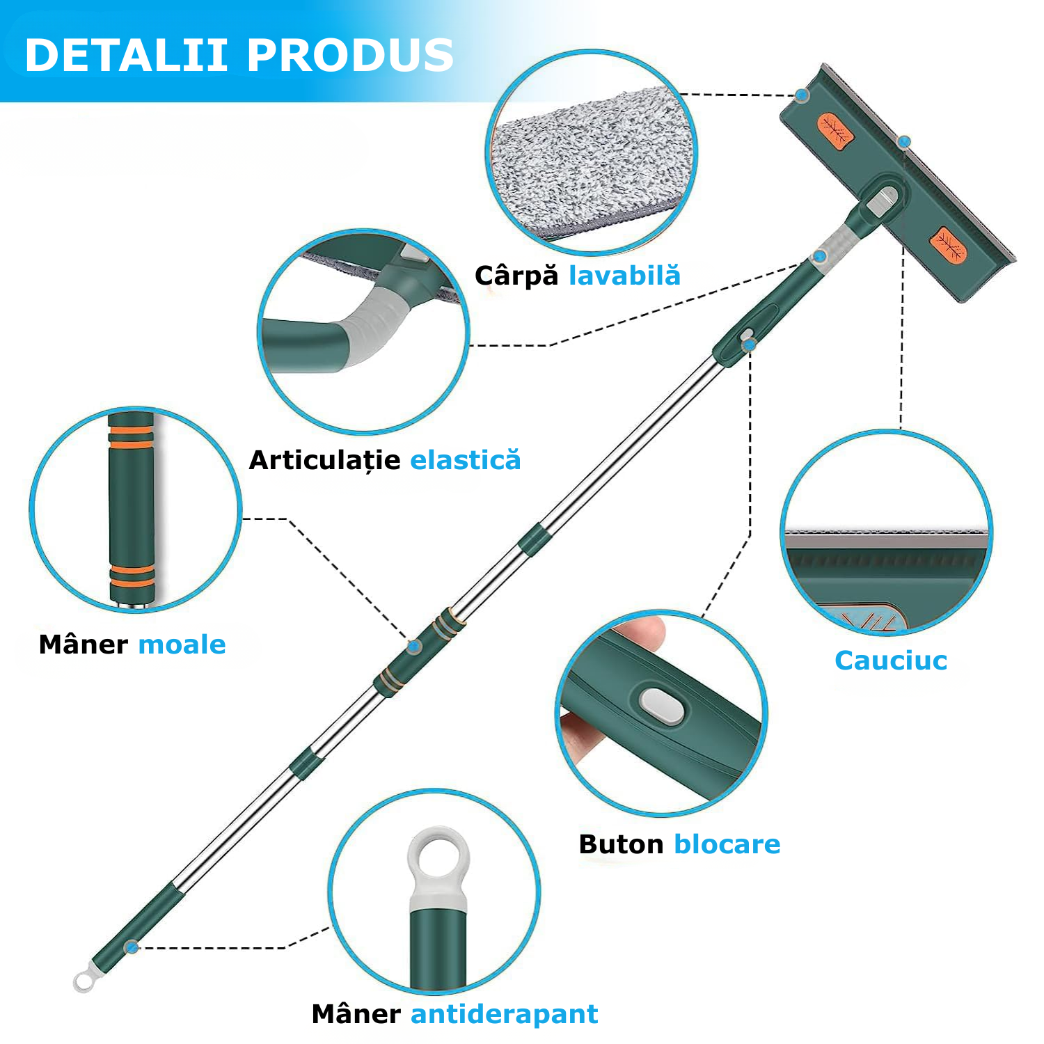| Continut pachet | 1 x Curatator de geamuri 3 x Laveta din microfibra 1 x Coada telescopica 1 x Spalator geam 1 x racleta geam 1 x Dispozitiv de spalat geamurile |